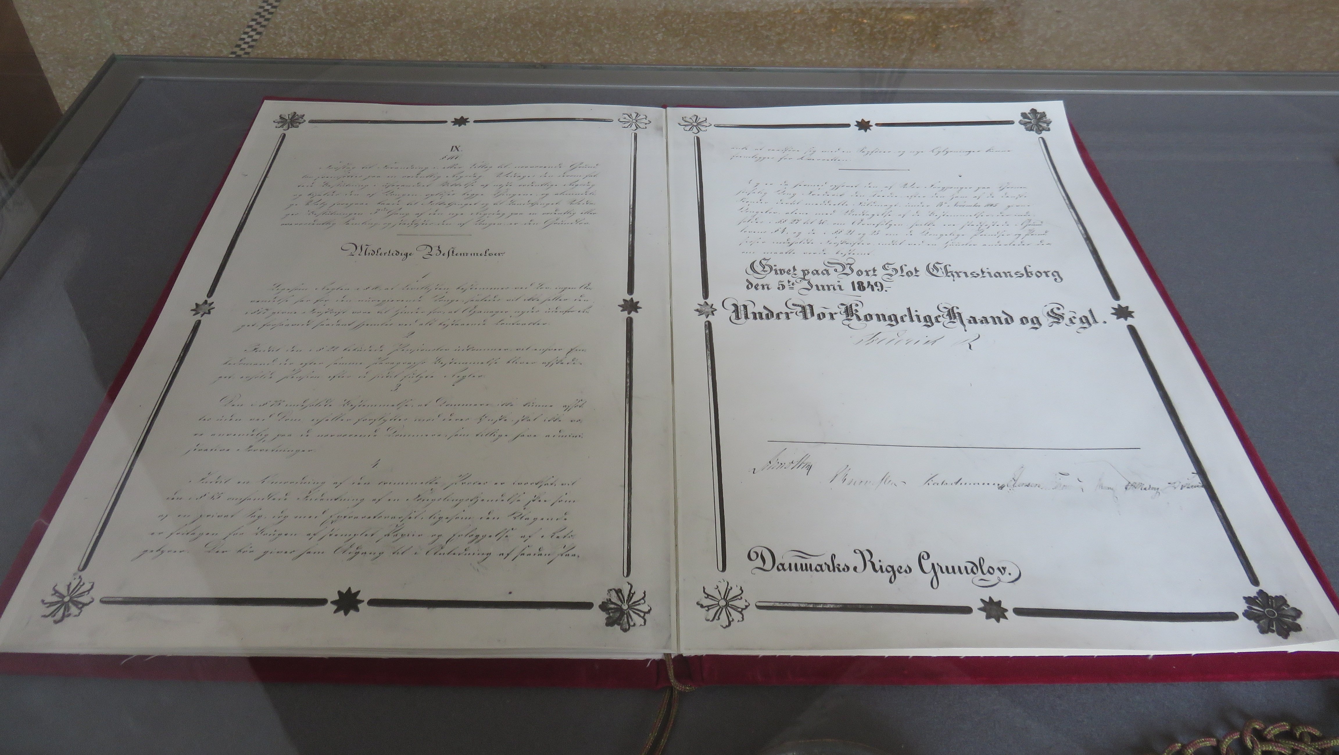 Den 5. juni 1849 underskrev Frederik den 7. Danmarks første grundlov, der i dag også bliver kaldt Junigrundloven. Hermed blev Danmark officielt et konstitutionelt monarki.8