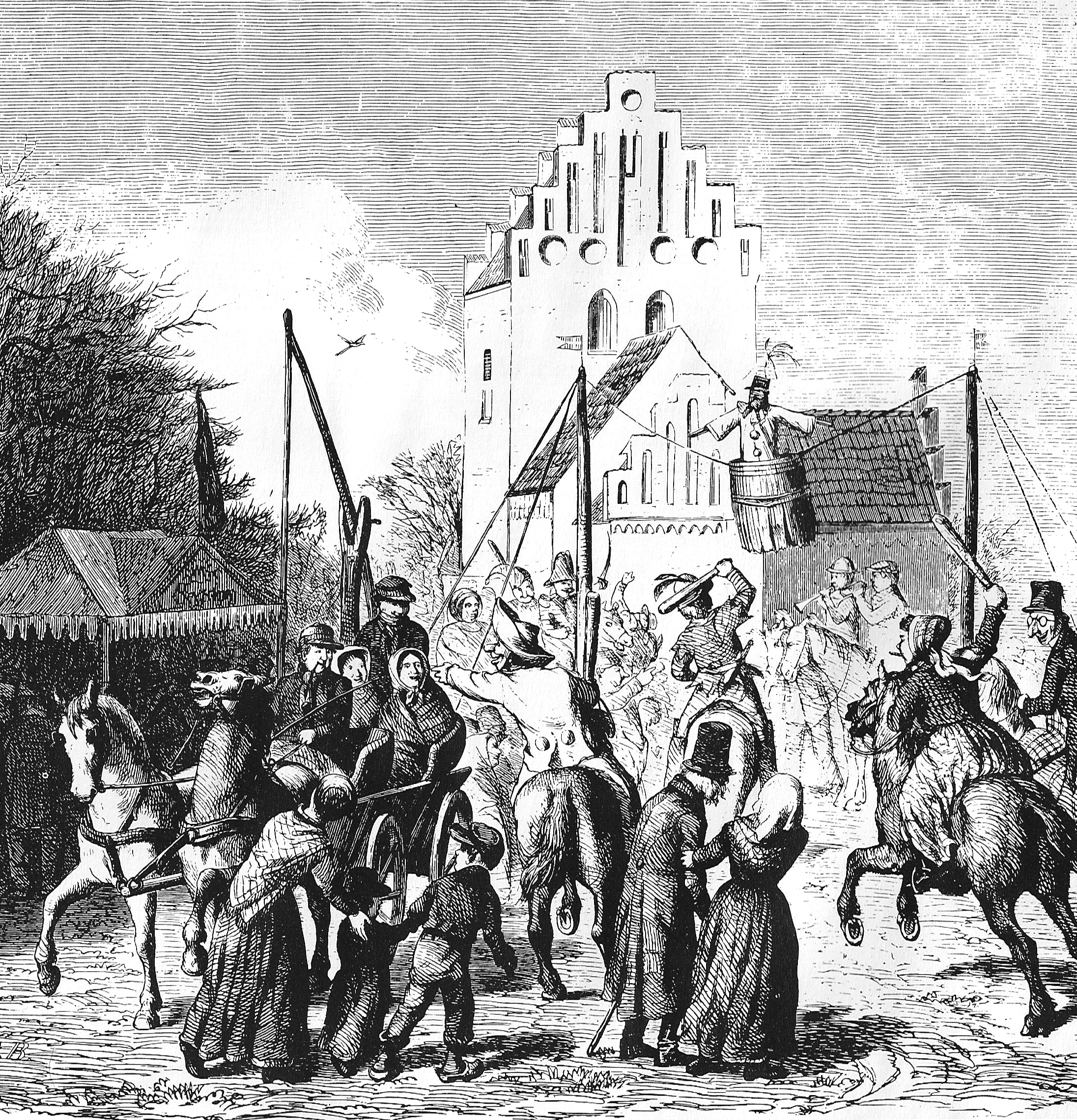 Til festlighederne hørte der også konkurrencer som ringridning og at stikke til stråmanden (en udstoppet halmfigur). Og så slog man katten af tønden, ofte til hest og med en levende kat i tønden. Katten symboliserede den ondskab, som man gennem troen og fasten gerne ville beskytte sig imod. Skikken med at slå katten af tønden kendes også fra Skåne og Holland, og man antager, at traditionen kom til Danmark med de hollandske bønder, som kom til Danmark under Christian II i 1500-tallet7.