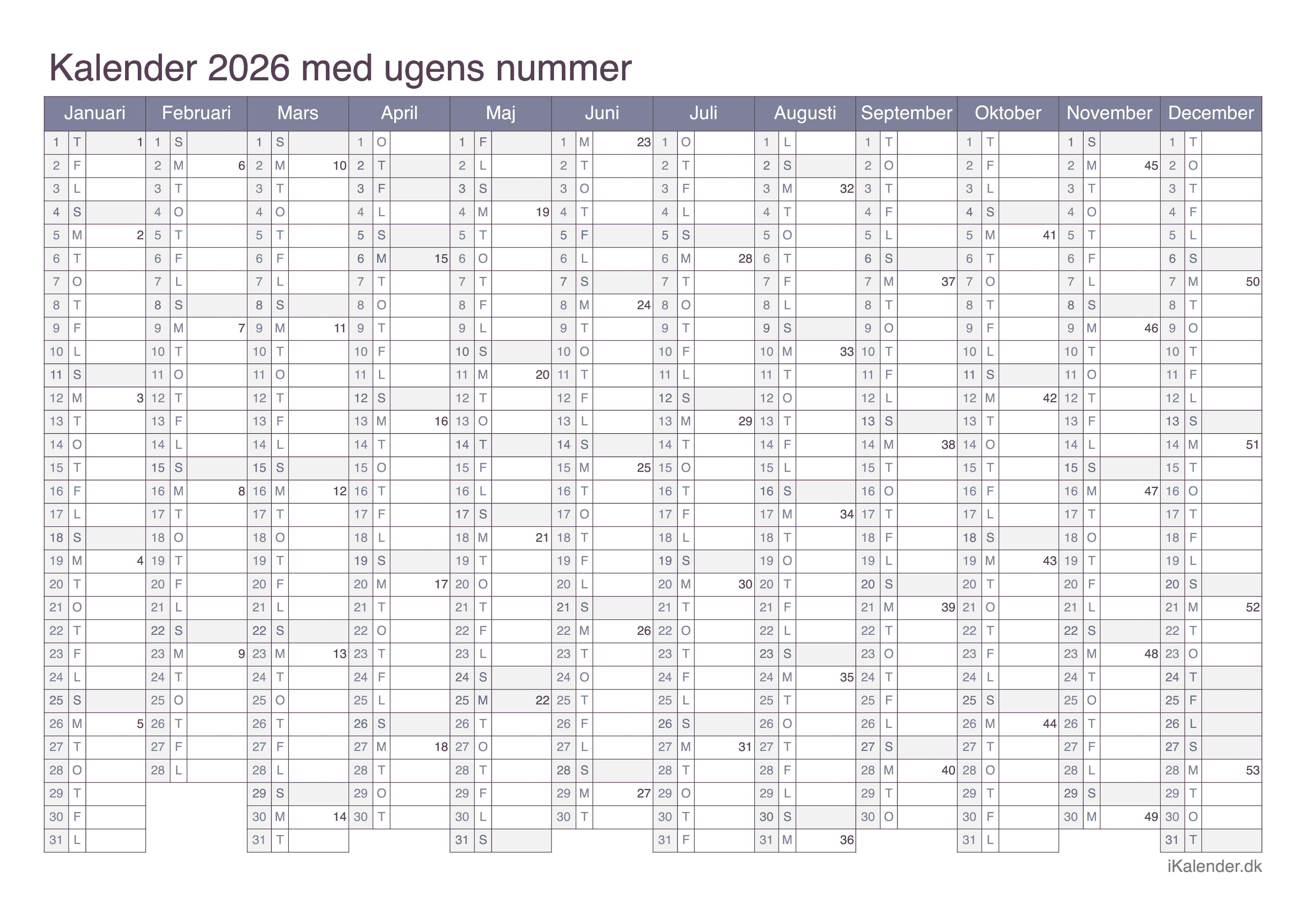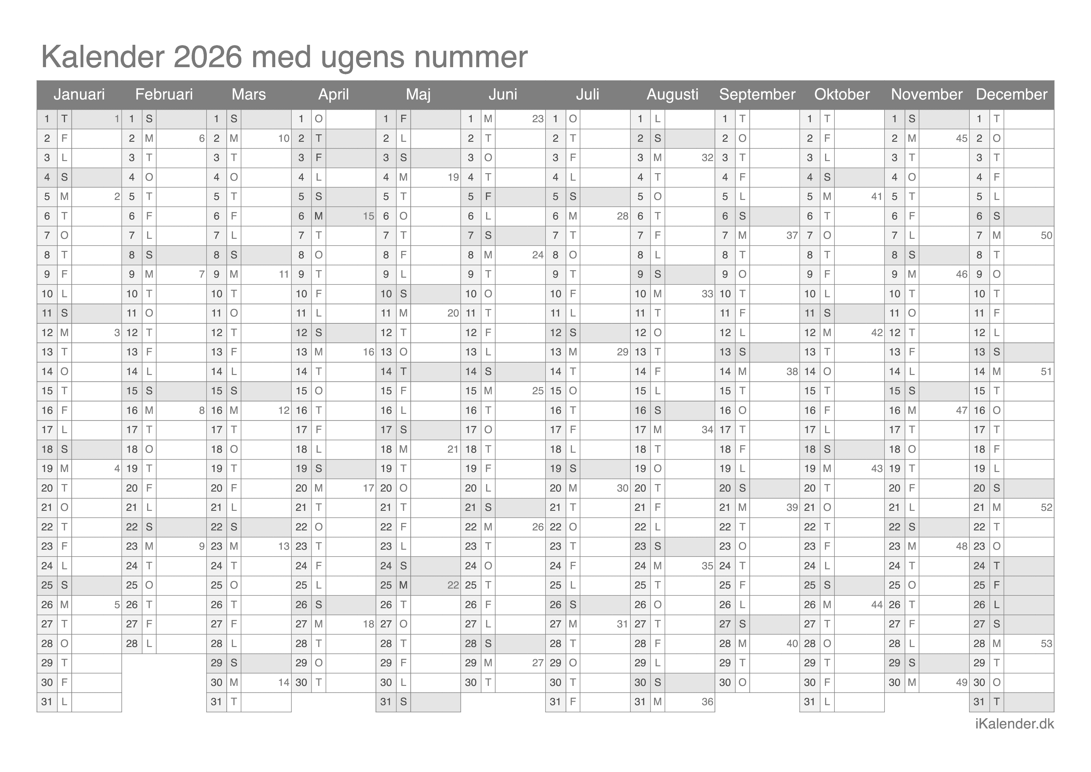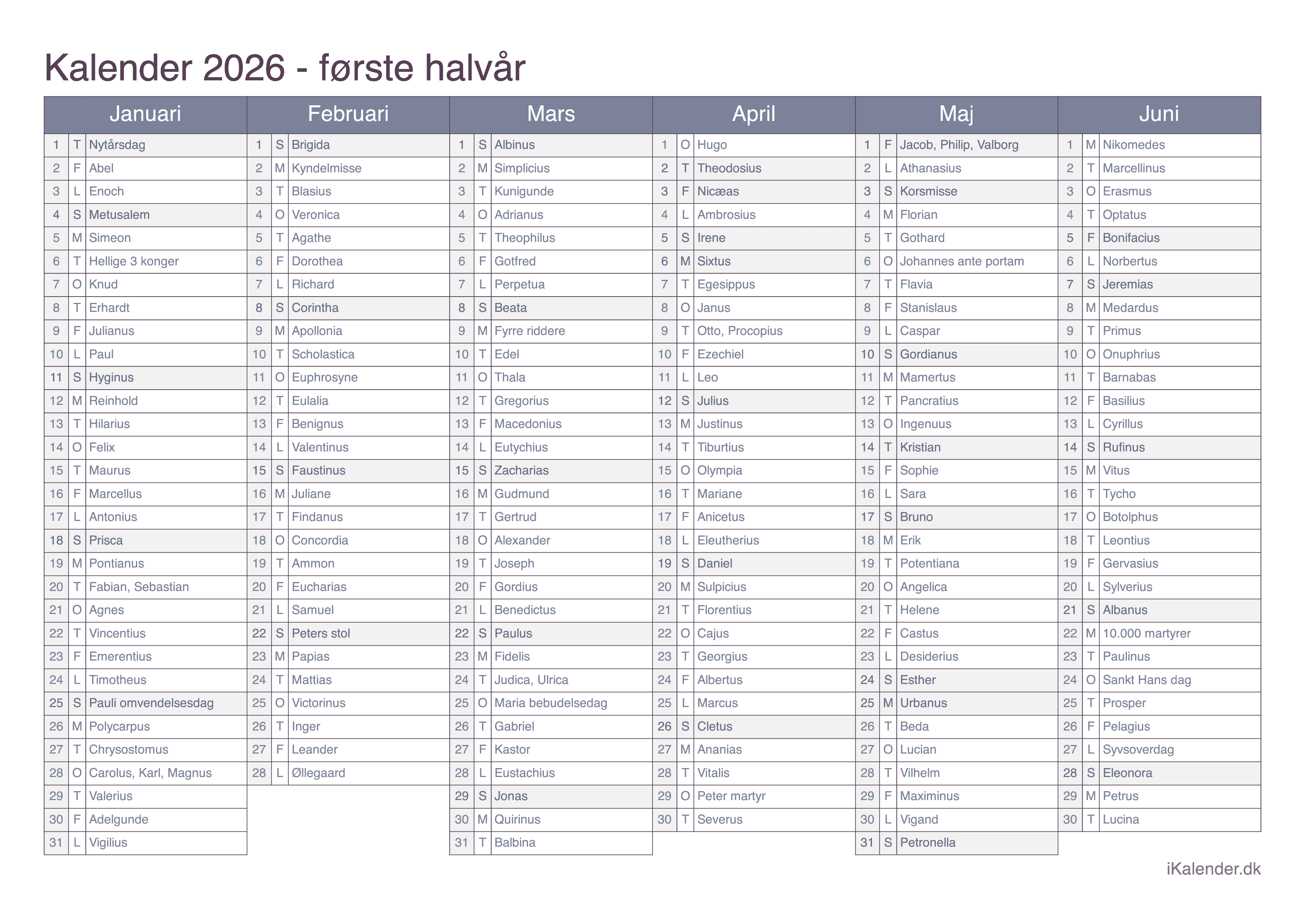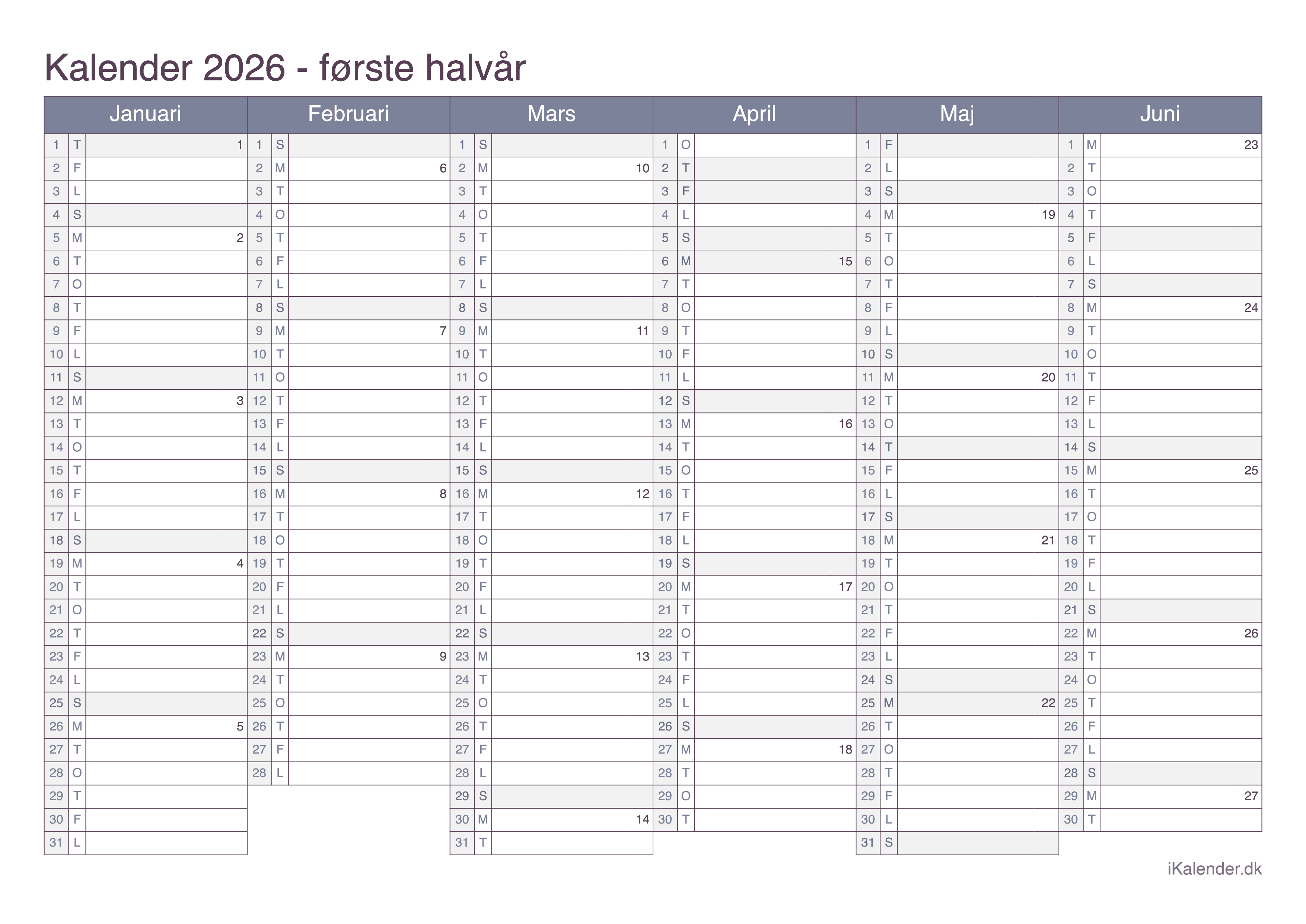 Vi tilbyder disse halvårlige kalendere for året 2026 klar til print: en tom kalender, en med ugenumre og en med helligdage og dagenes navne.