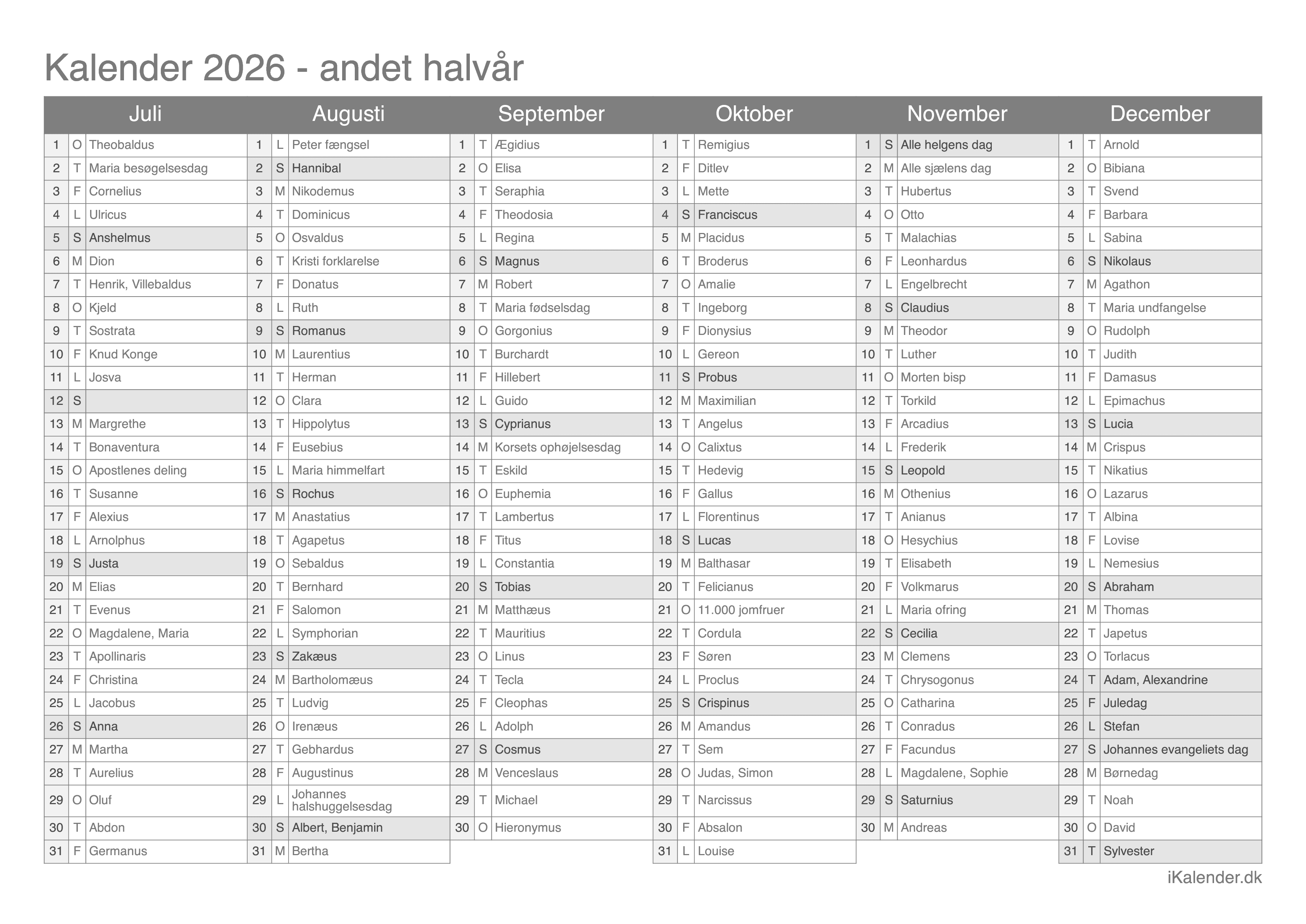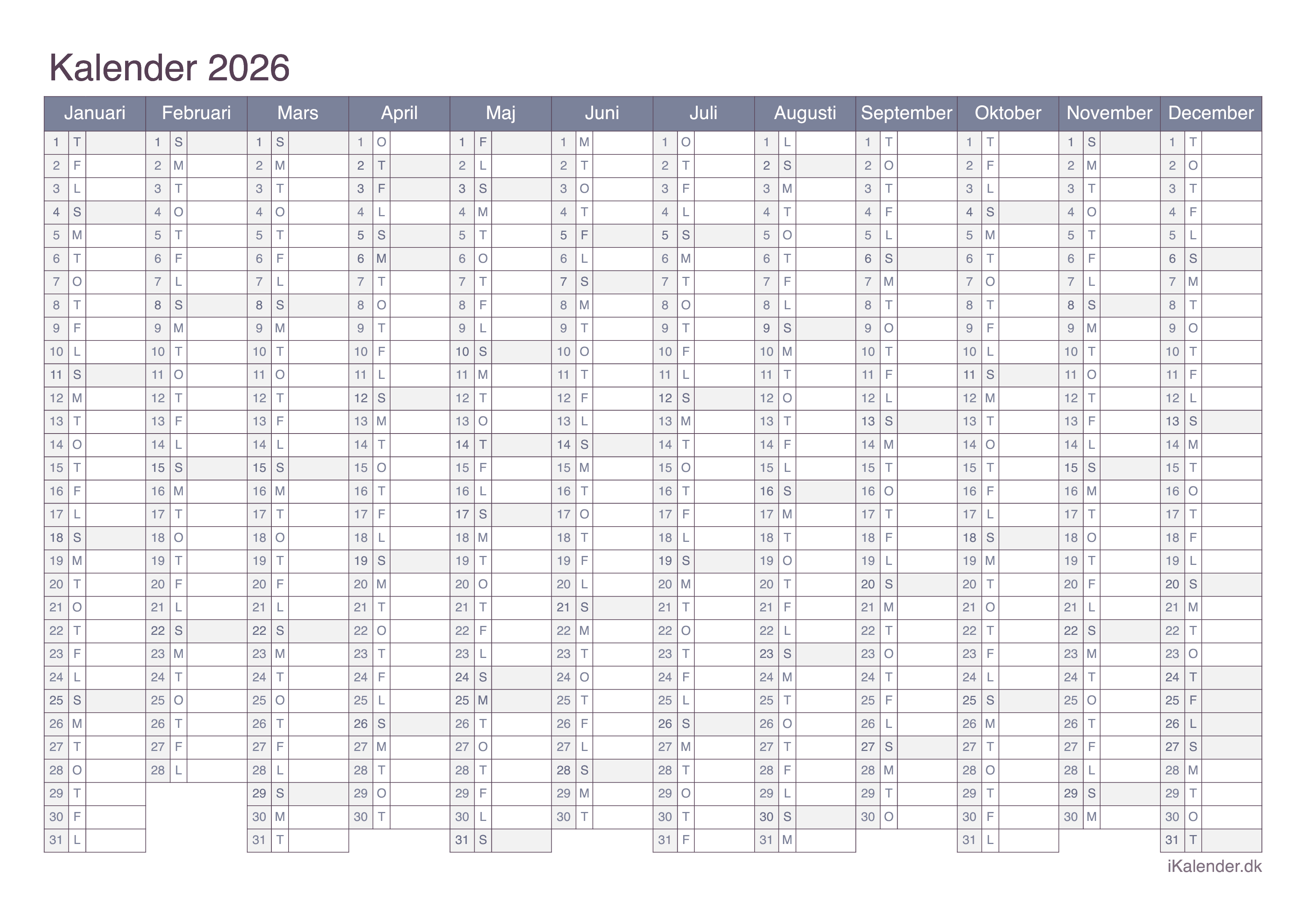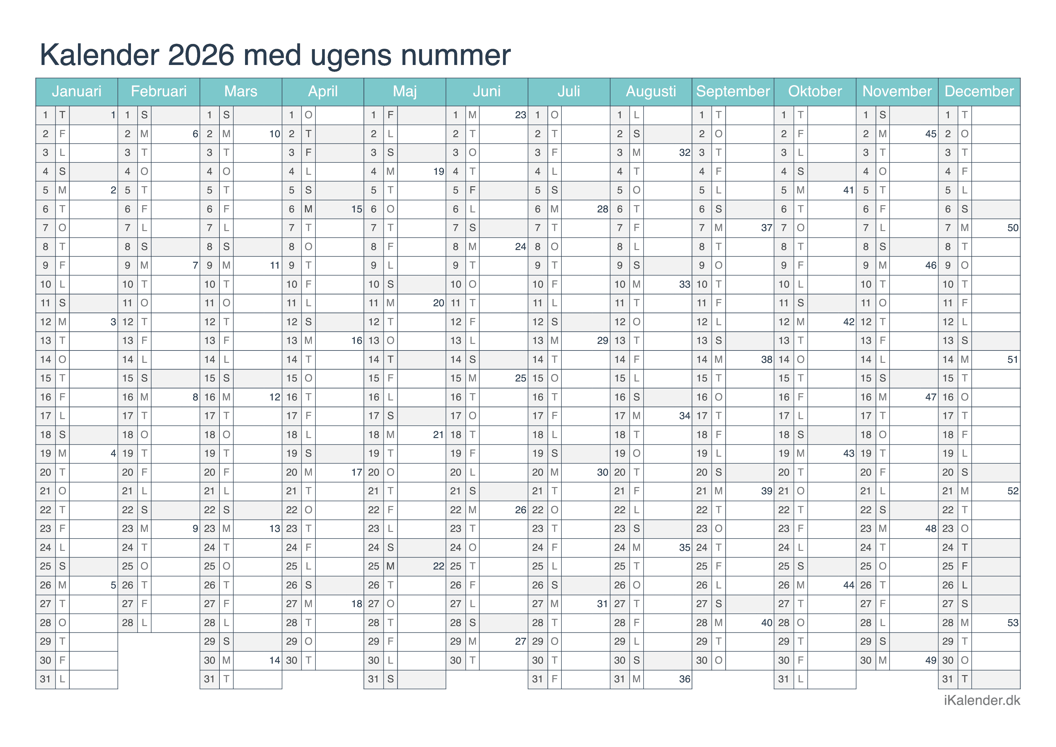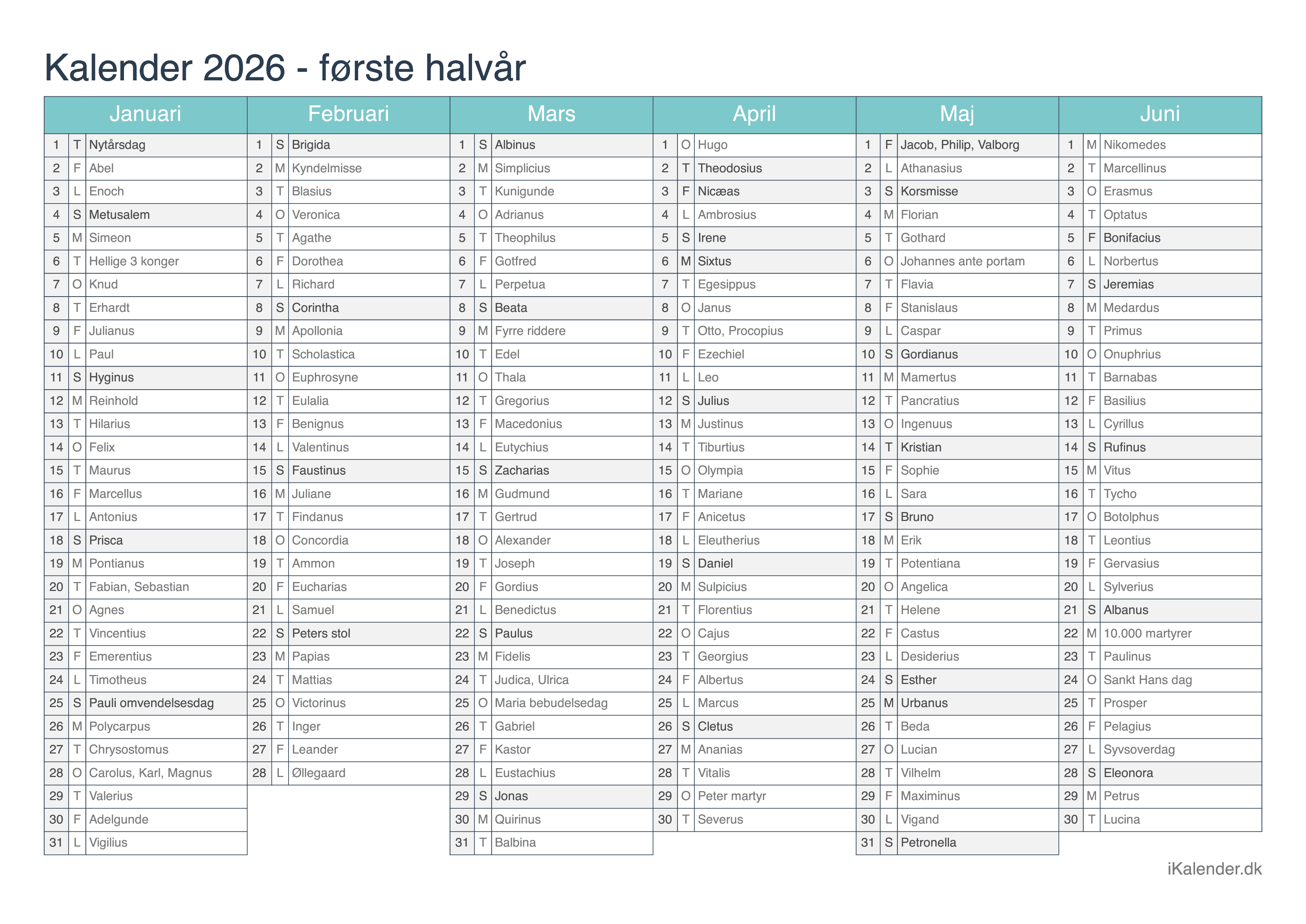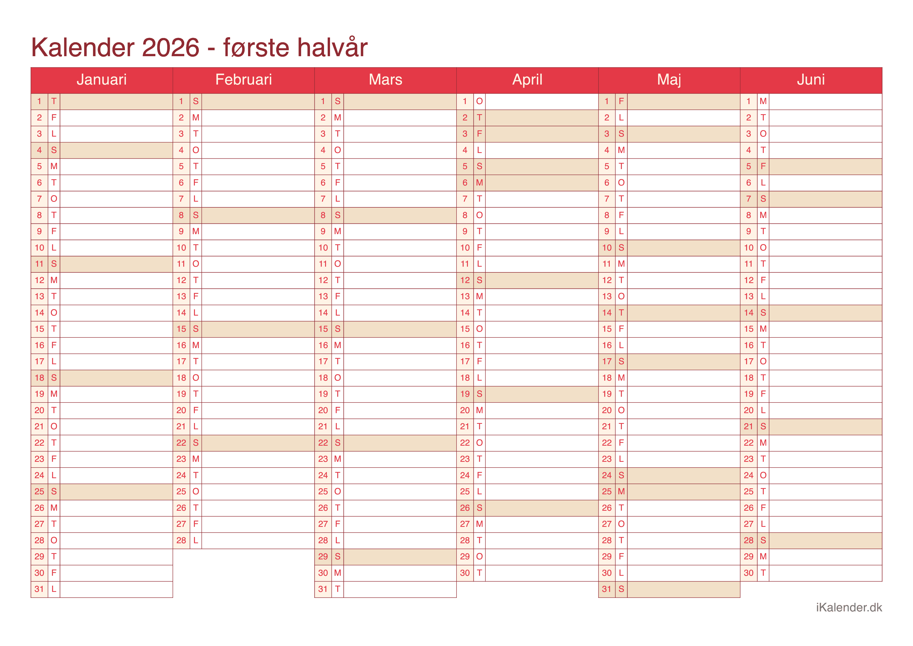 Vi tilbyder disse halvårlige kalendere for året 2026 klar til print: en tom kalender, en med ugenumre og en med helligdage og dagenes navne.