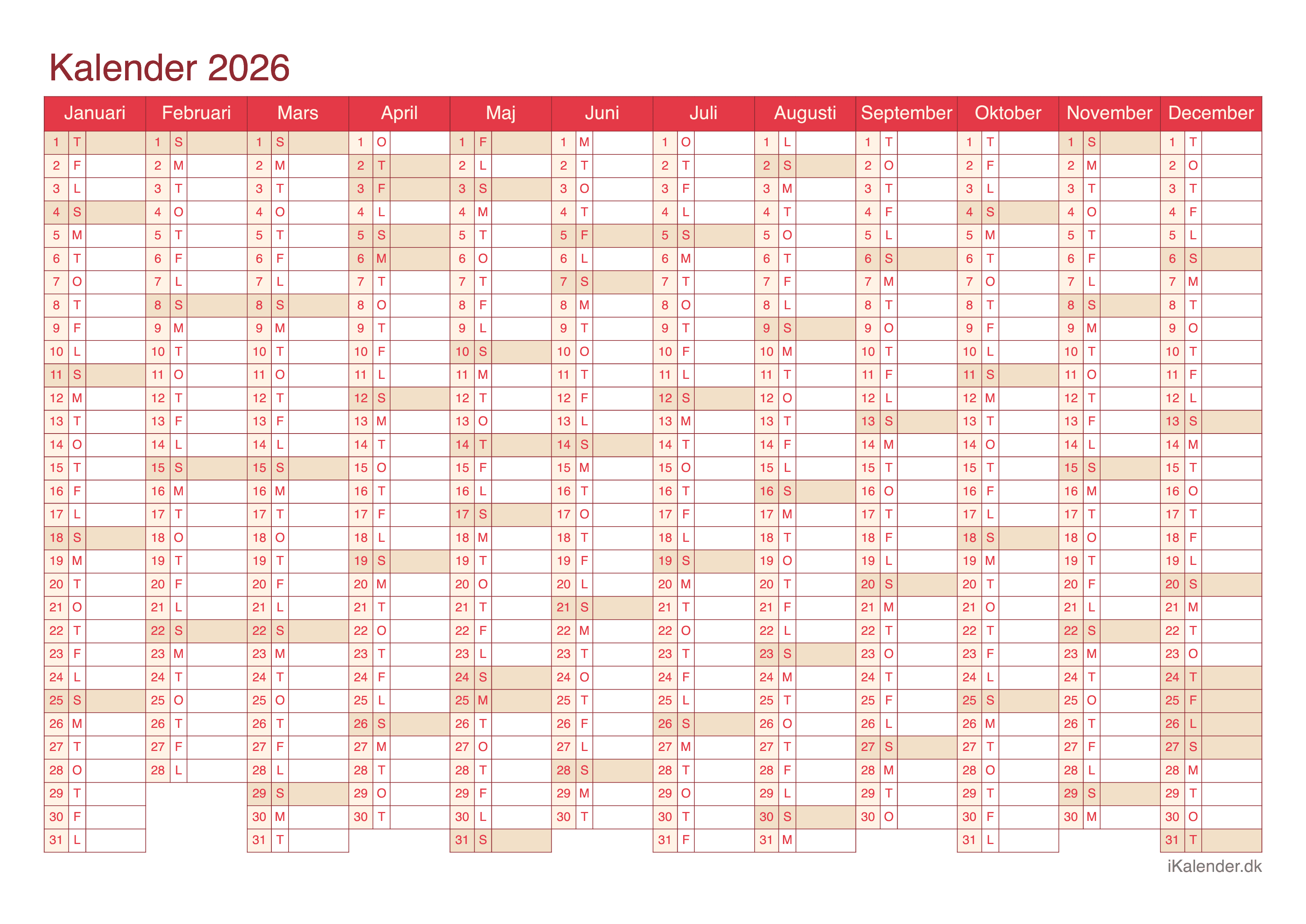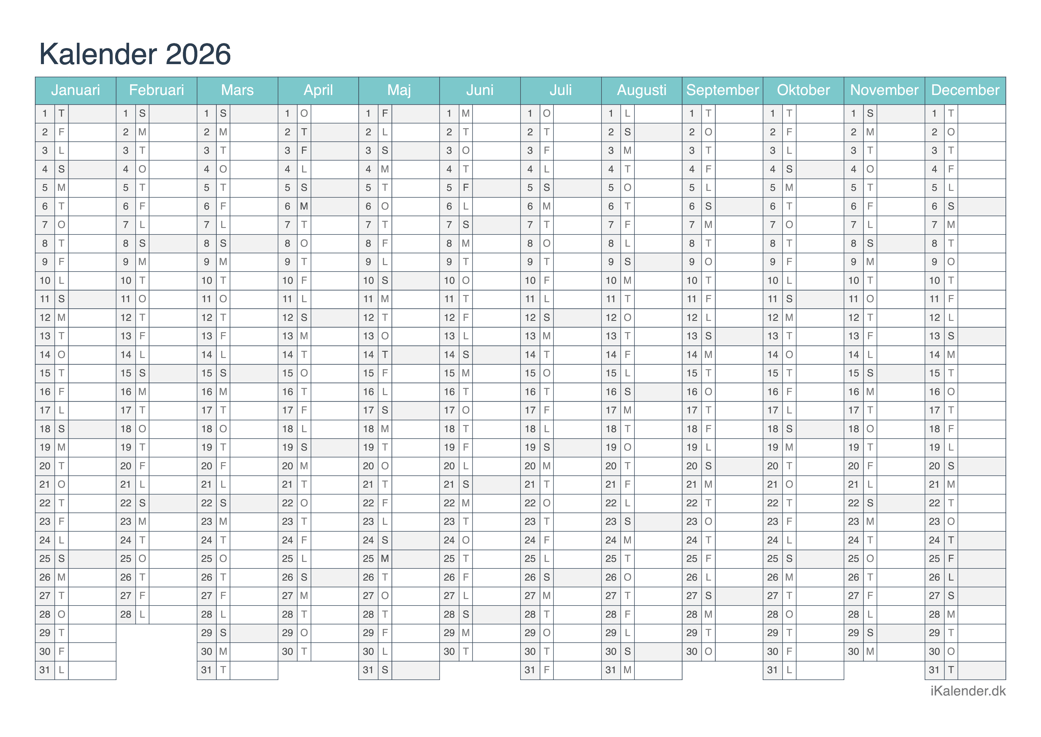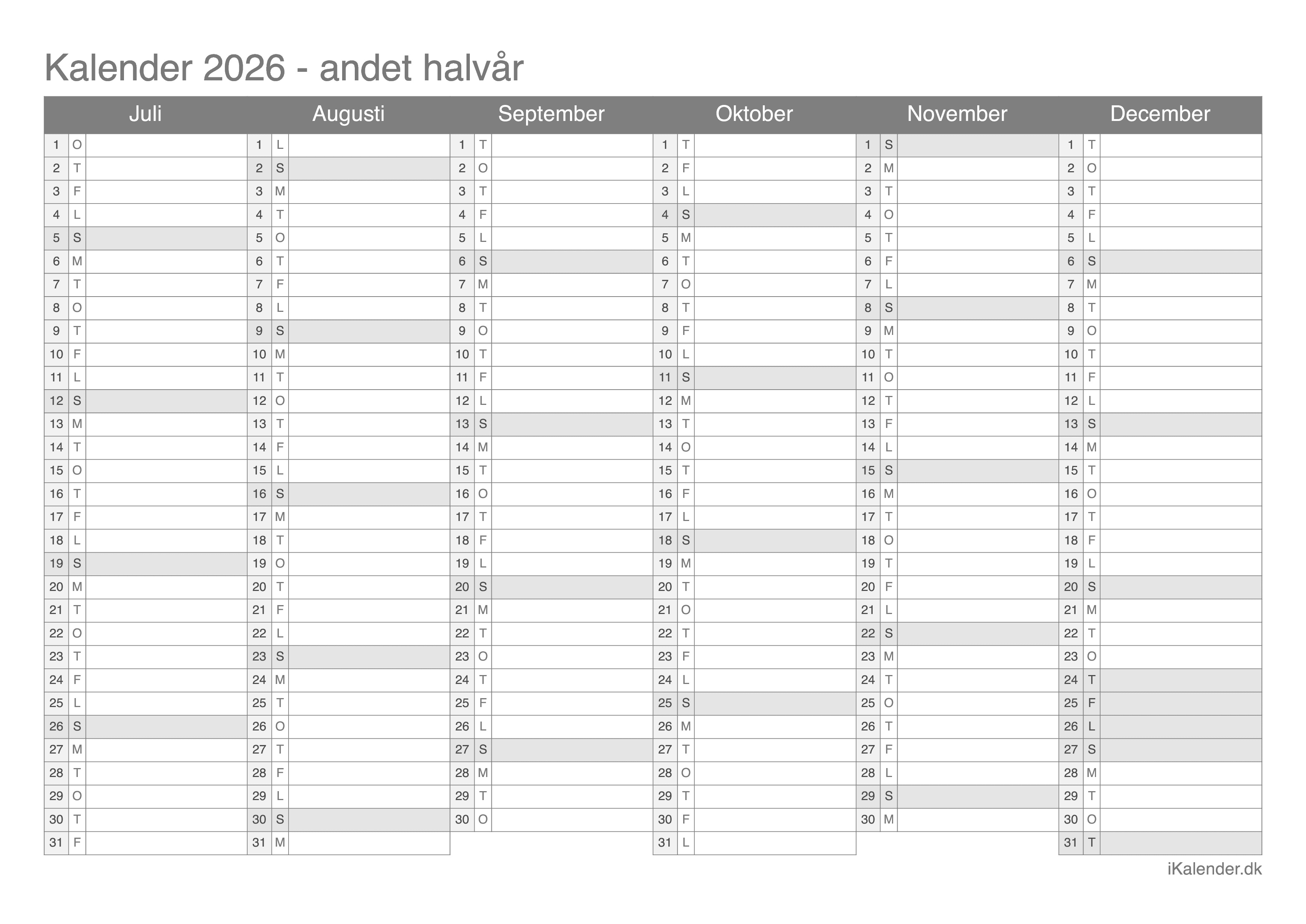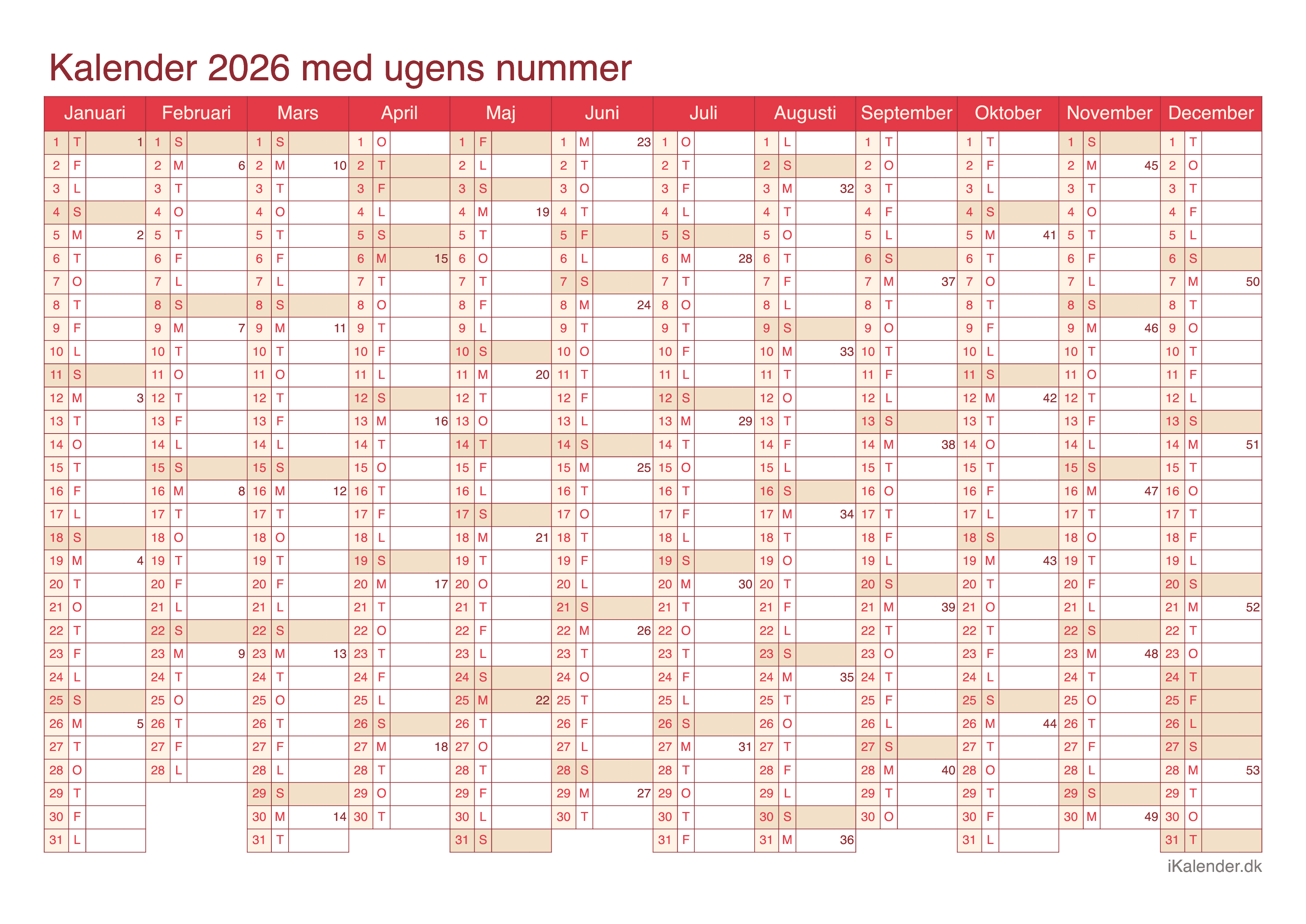 Vi tilbyder disse halvårlige kalendere for året 2026 klar til print: en tom kalender, en med ugenumre og en med helligdage og dagenes navne.