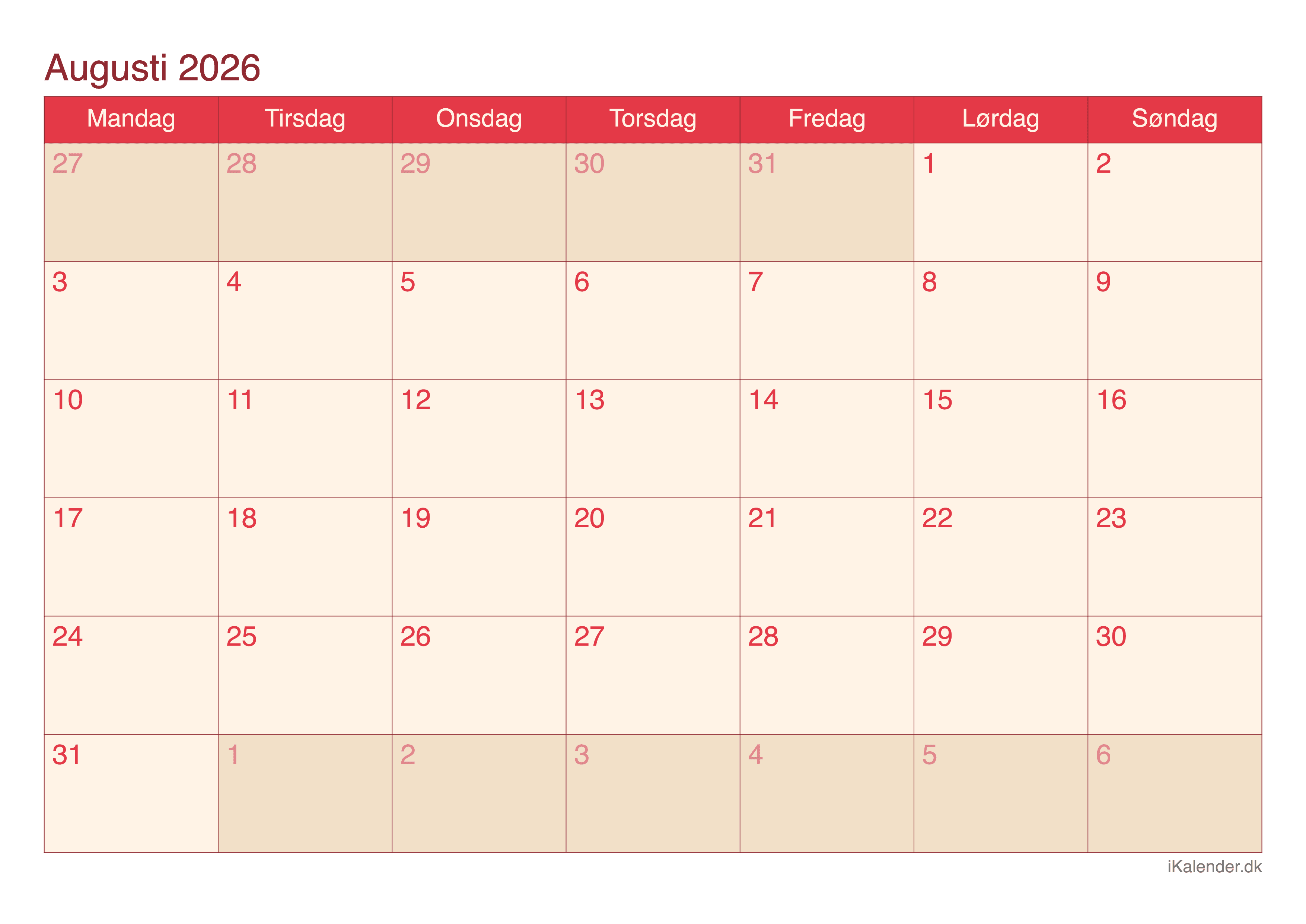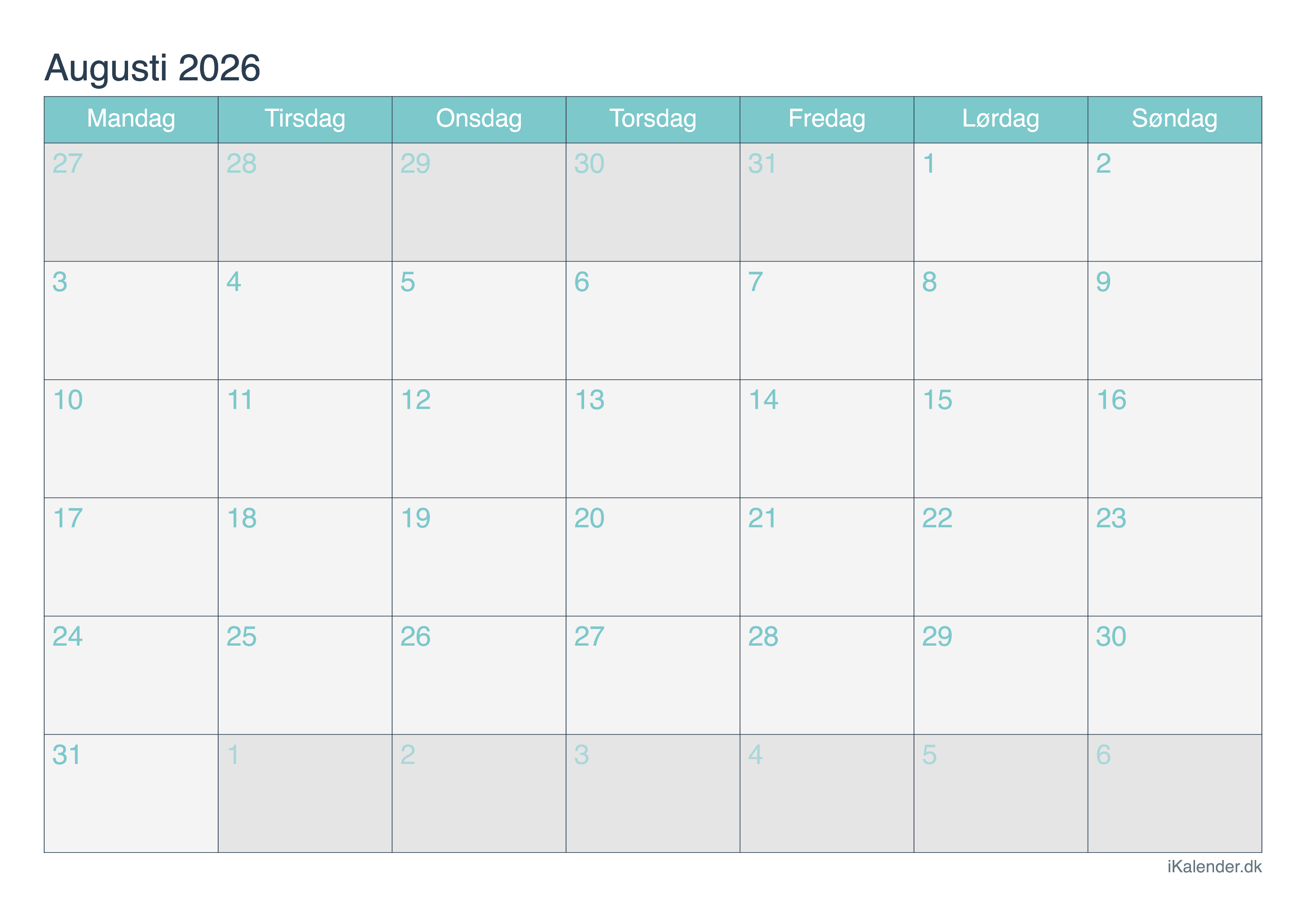 Du kan frit downloade og printe kalenderen for august 2026 i et tomt format som billede, PDF og Excel. Find også andre temaer til kalenderen 2026 for måneden august.