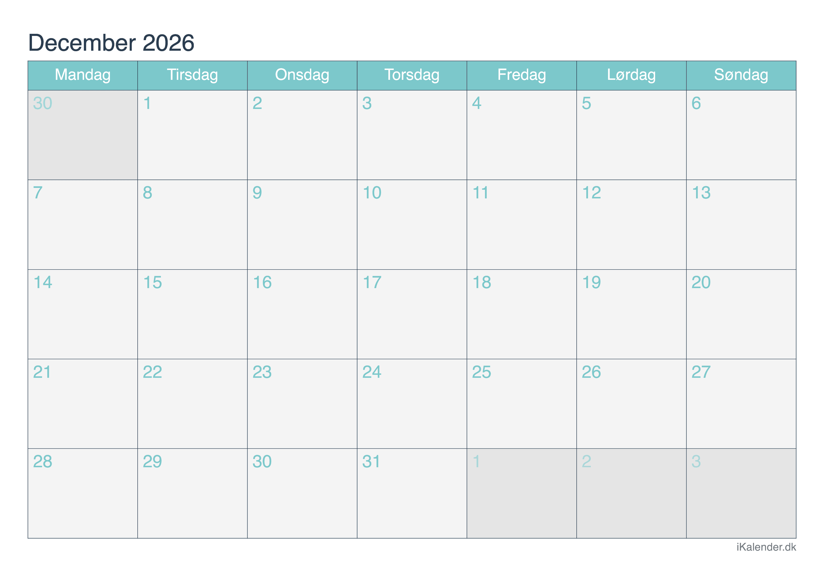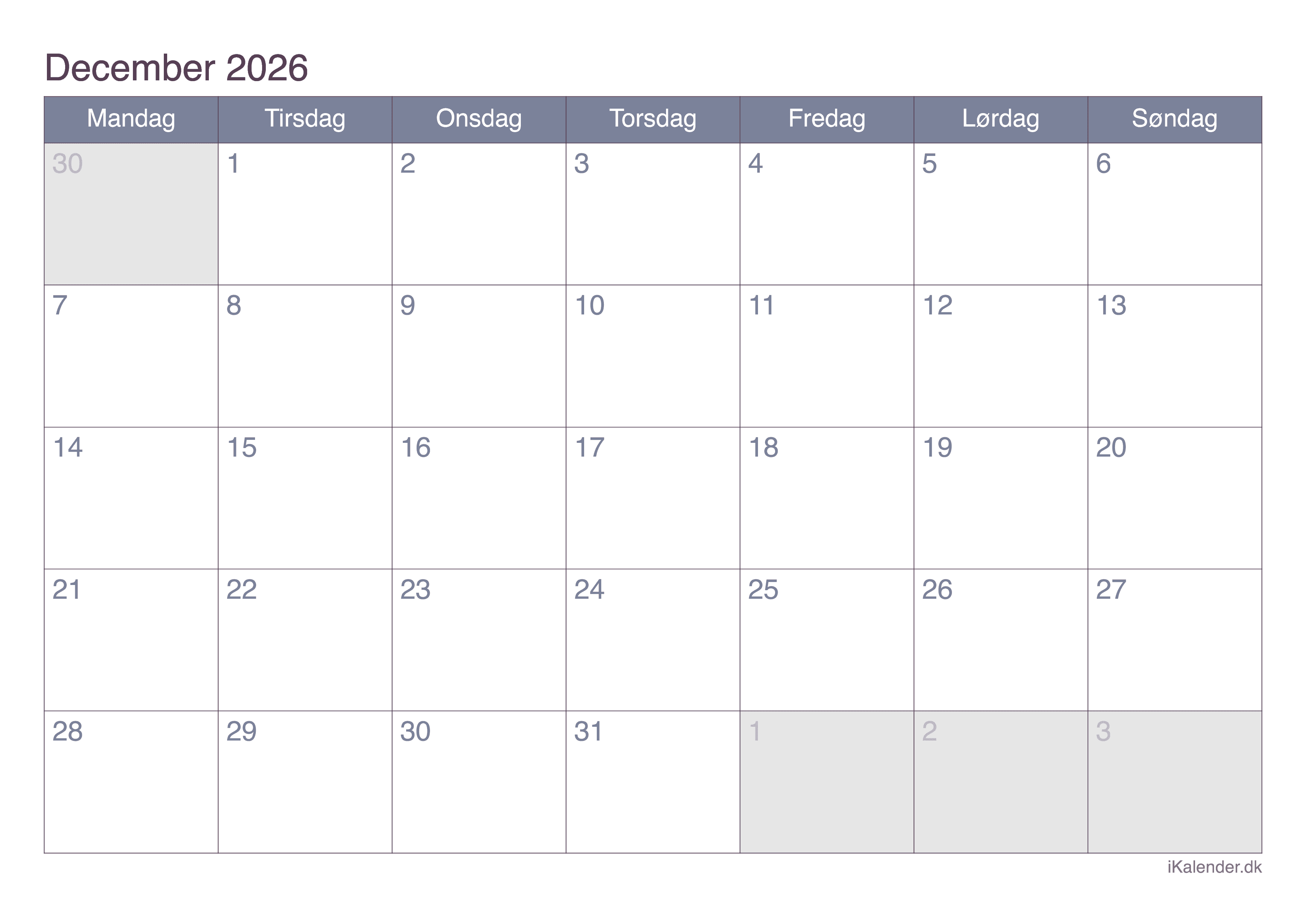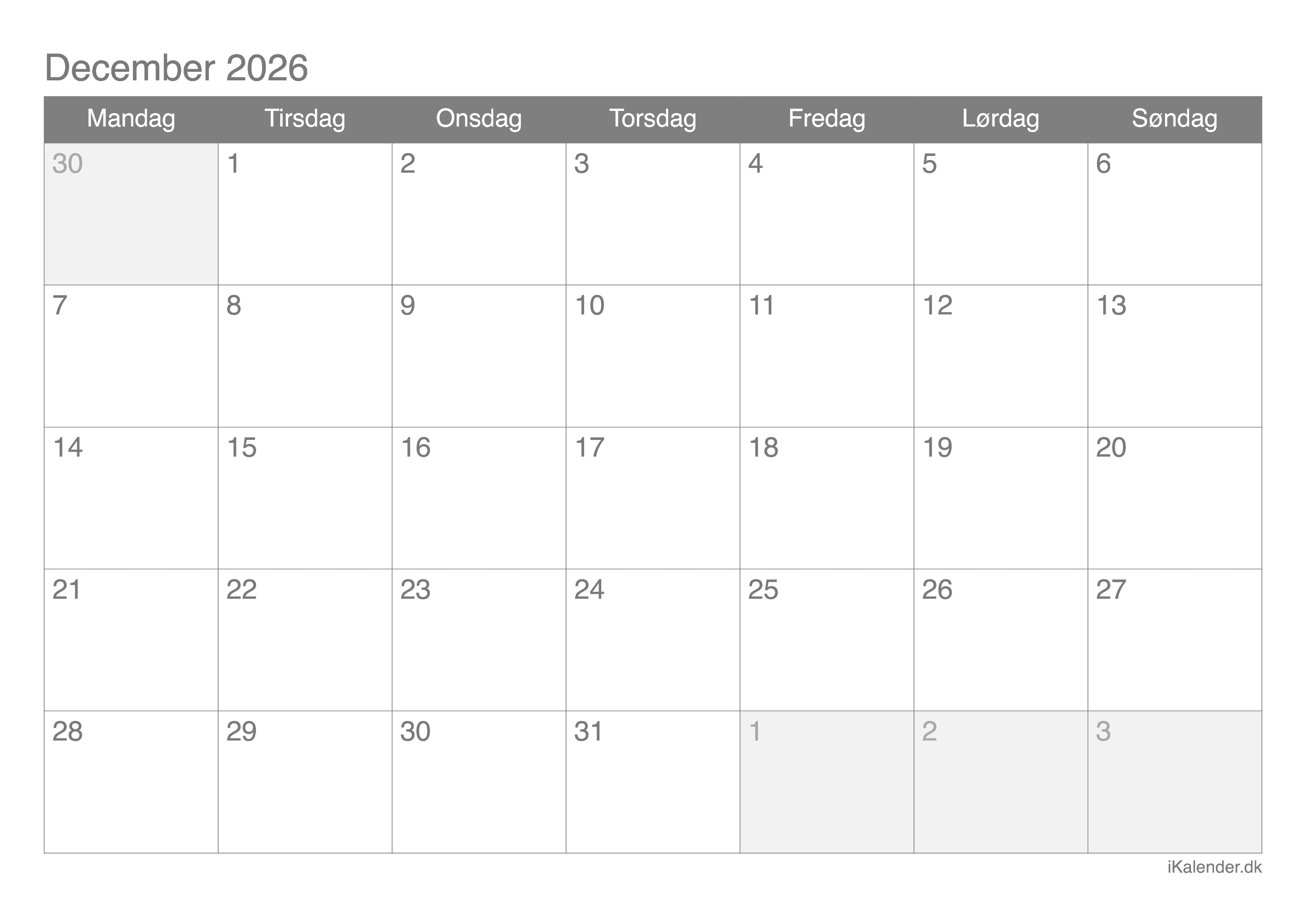 Du kan frit downloade og printe kalenderen for december 2026 i et tomt format som billede, PDF og Excel. Find også andre temaer til kalenderen 2026 for måneden december.