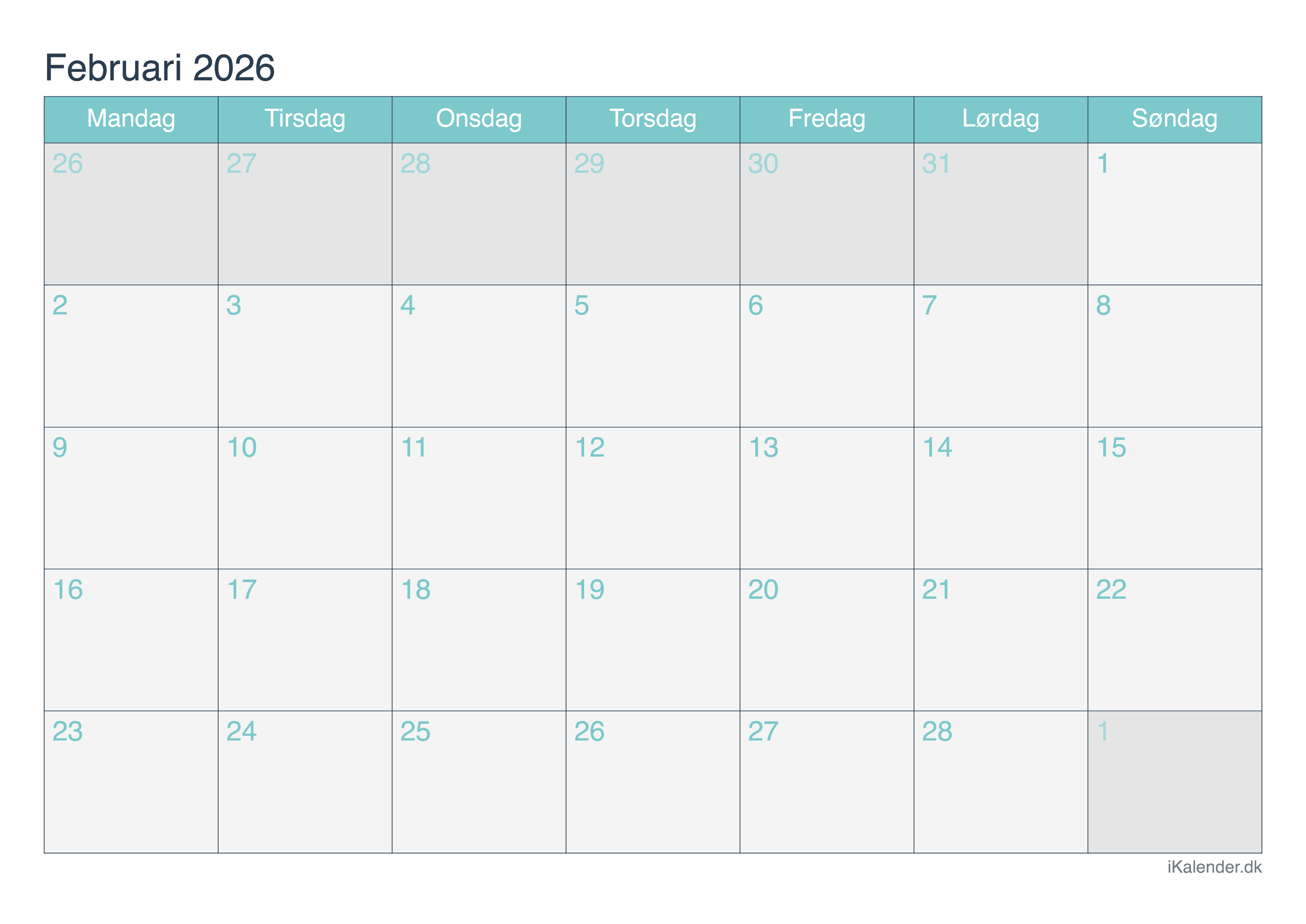 Du kan frit downloade og printe kalenderen for februar 2026 i et tomt format som billede, PDF og Excel. Find også andre temaer til kalenderen 2026 for måneden februar.