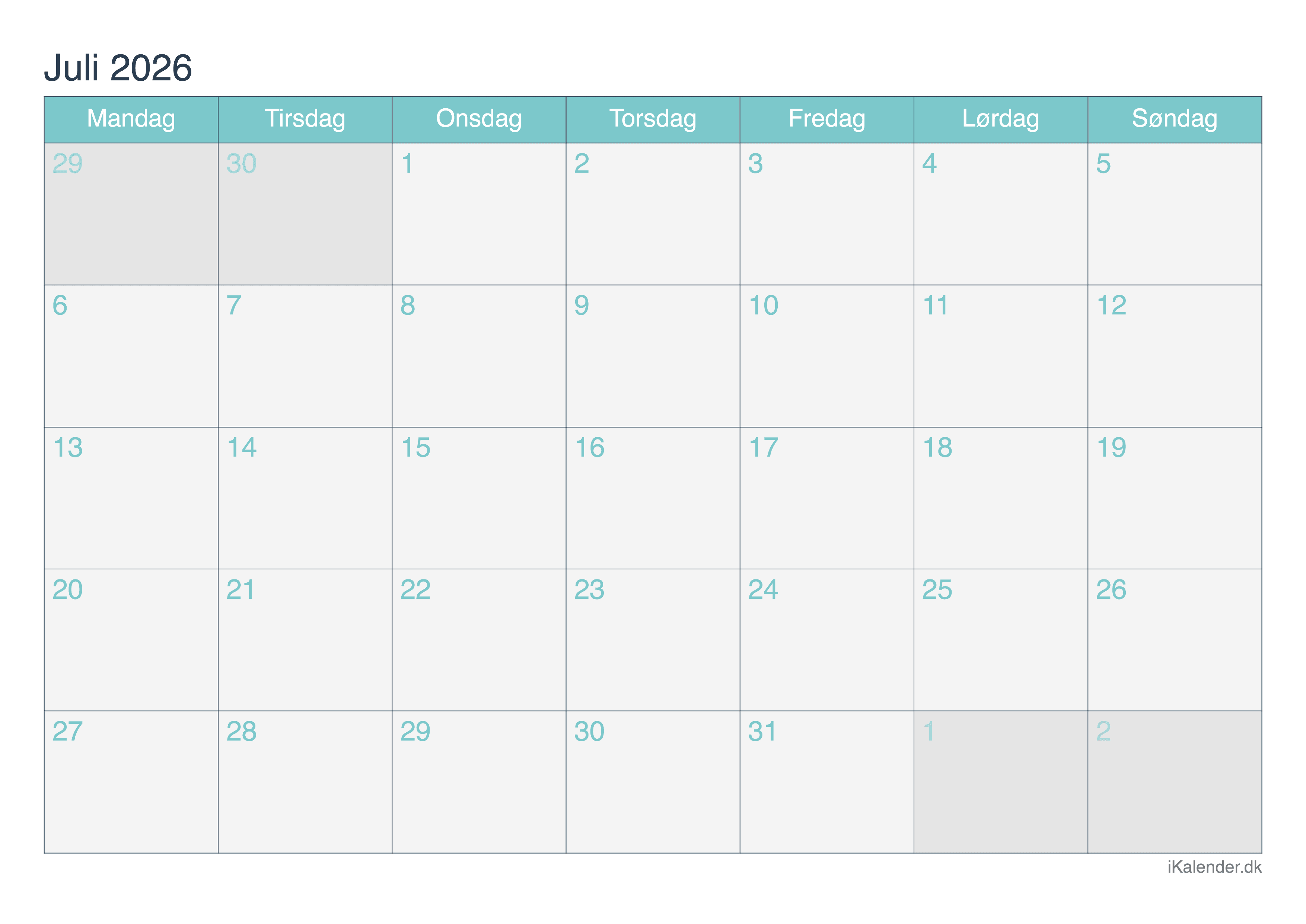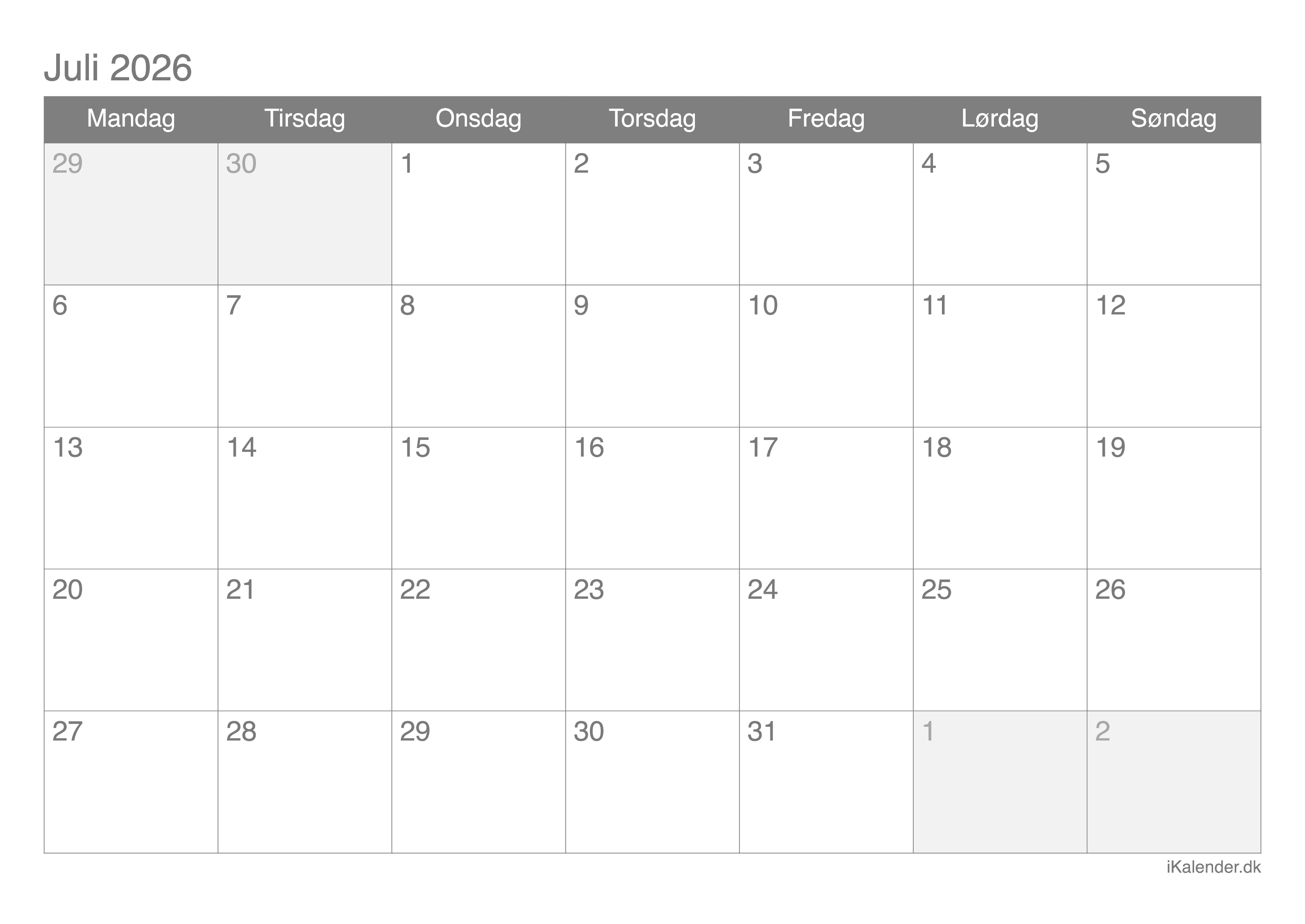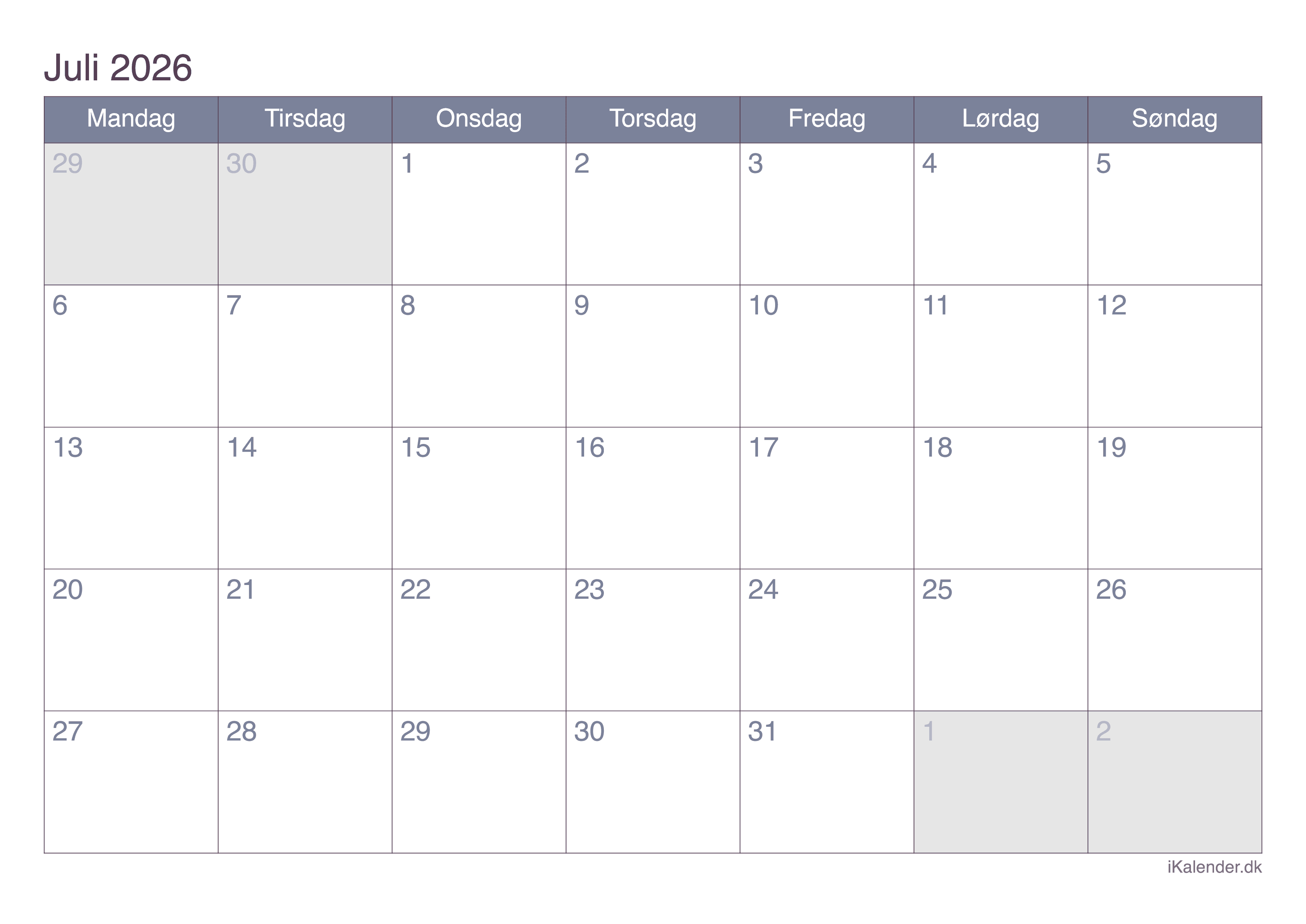 Du kan frit downloade og printe kalenderen for juli 2026 i et tomt format som billede, PDF og Excel. Find også andre temaer til kalenderen 2026 for måneden juli.