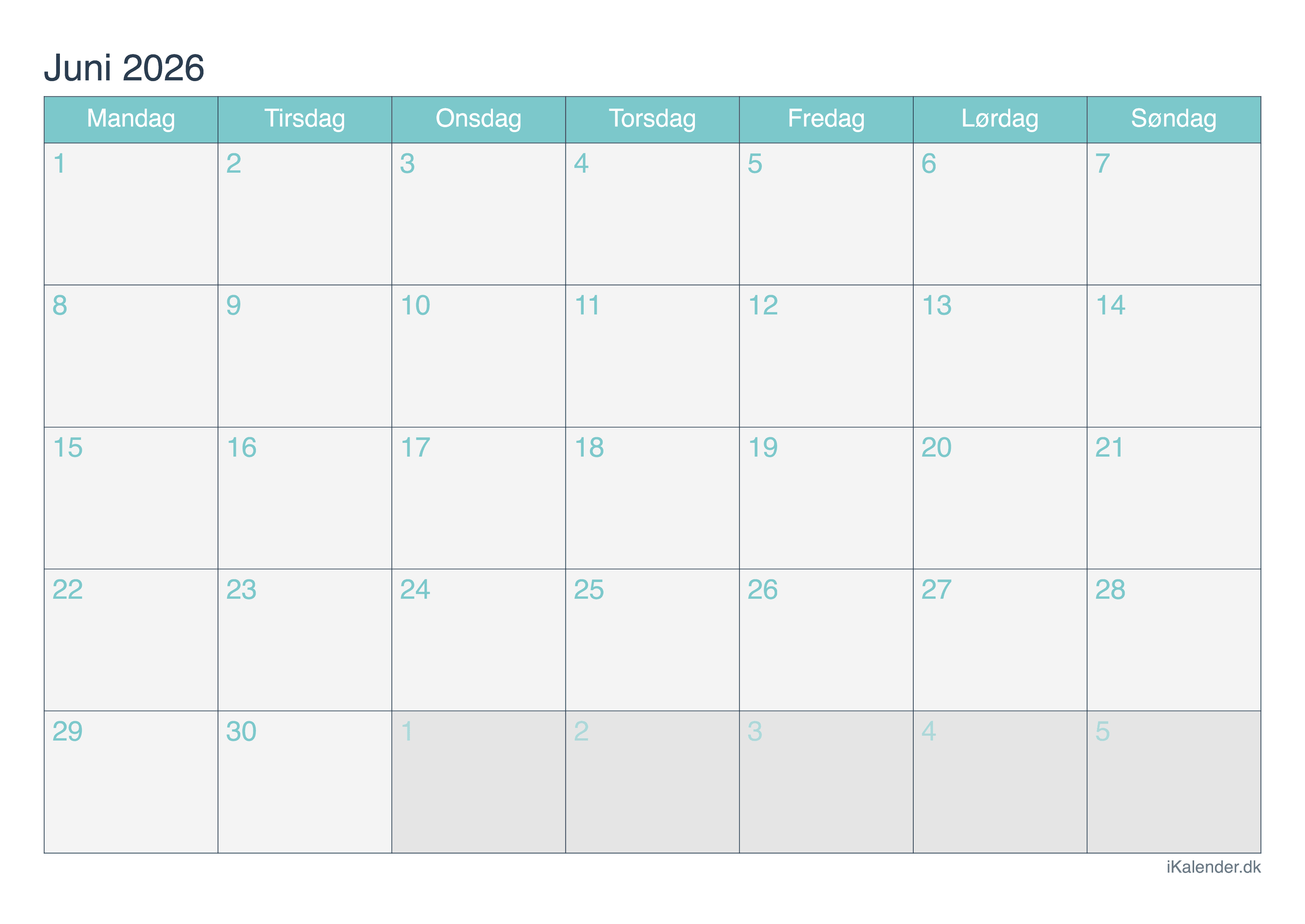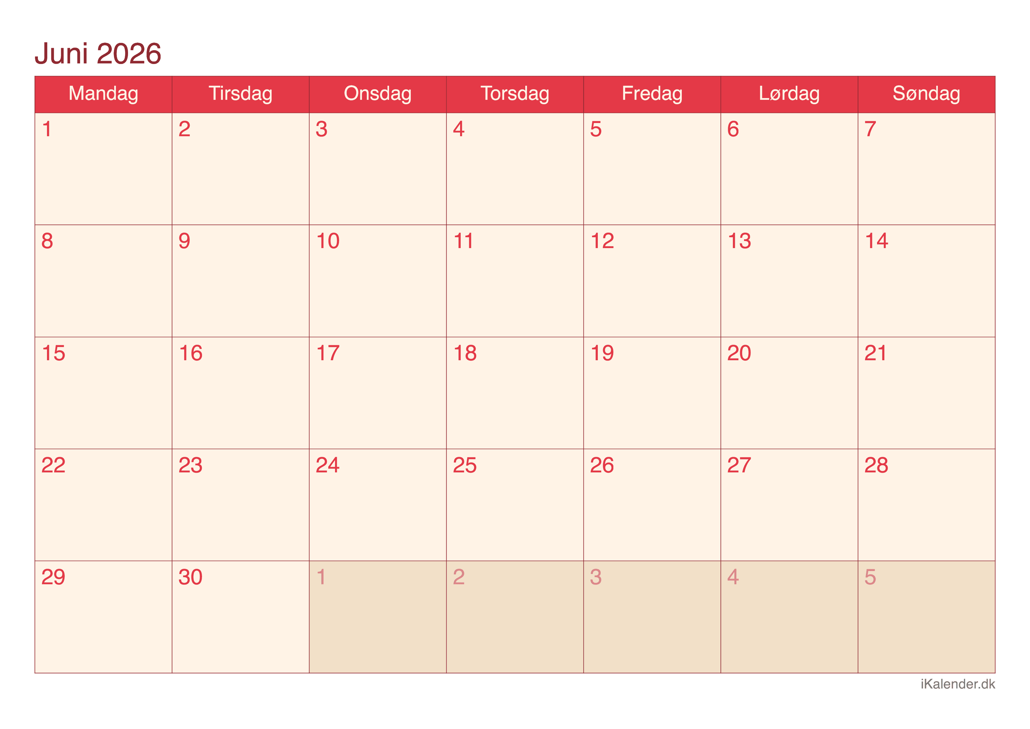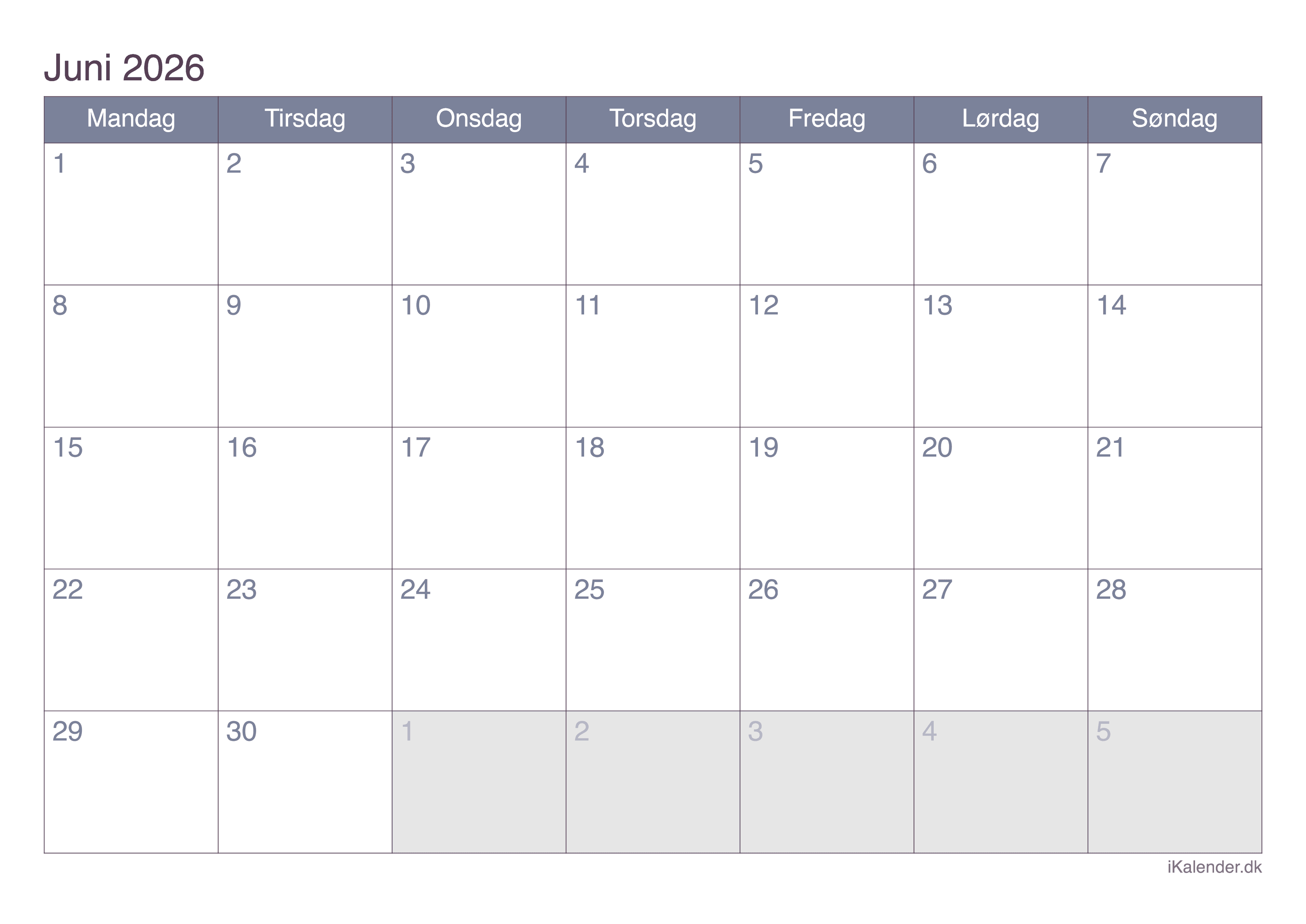 Kalender for juni 2026 klar til print