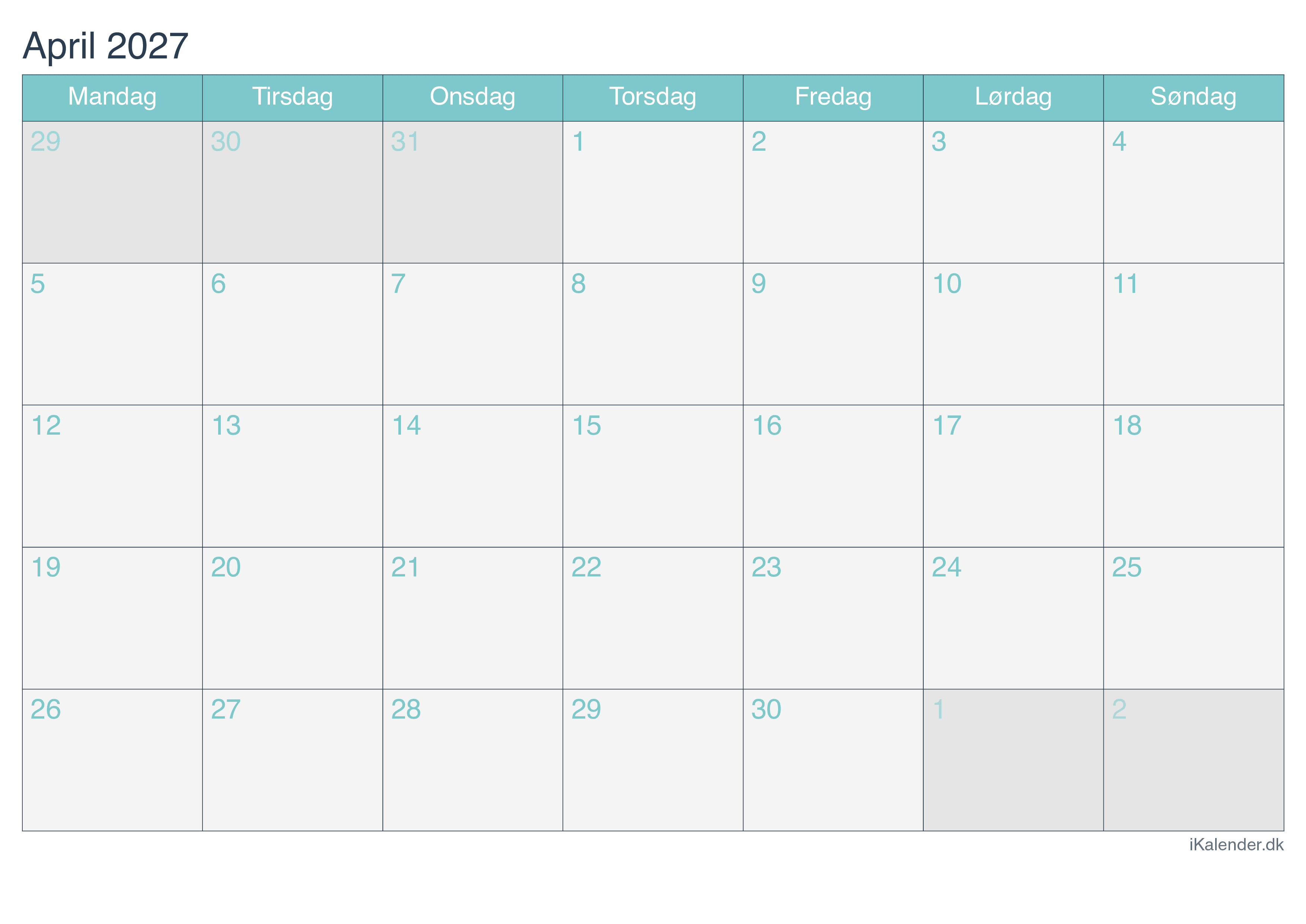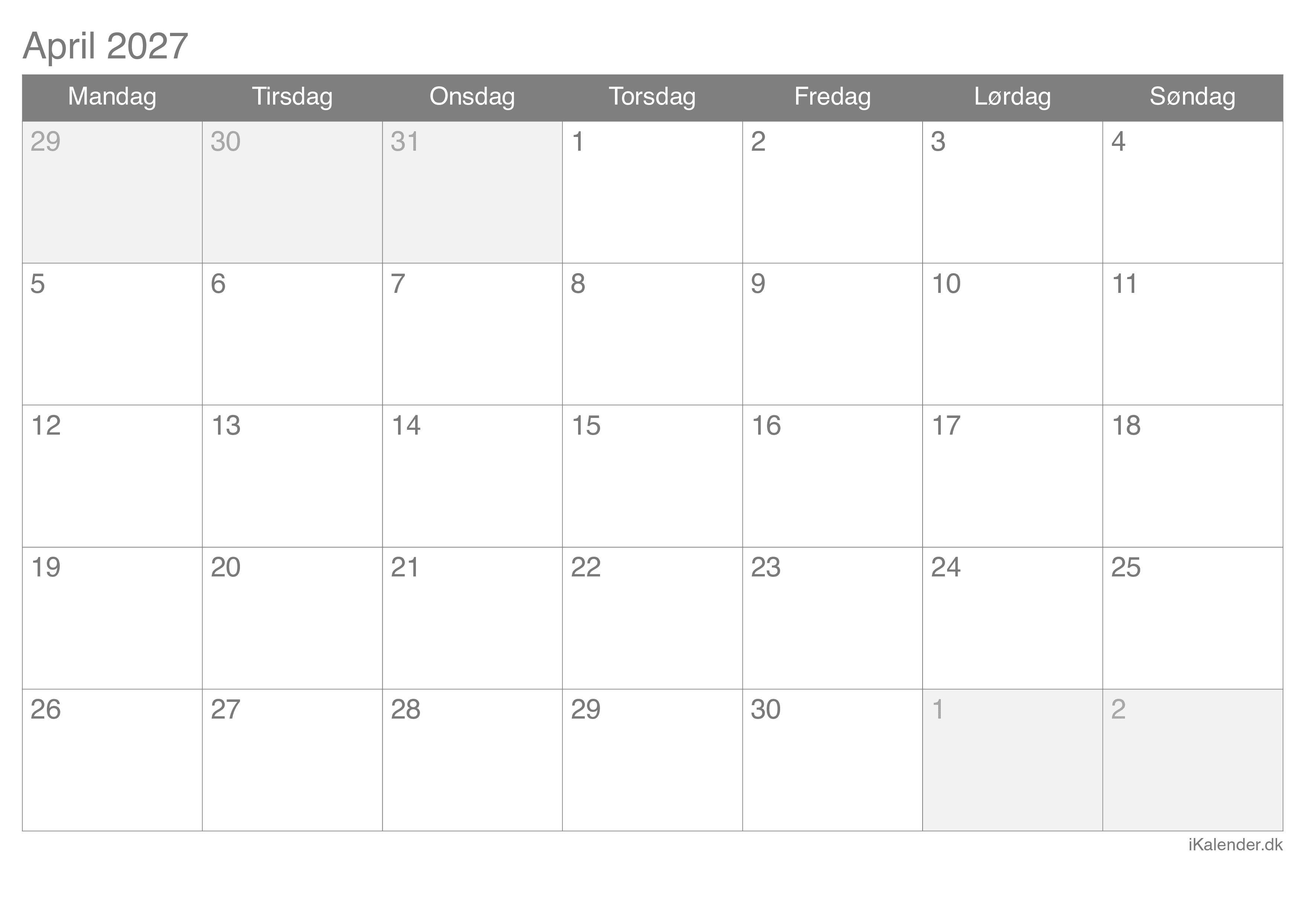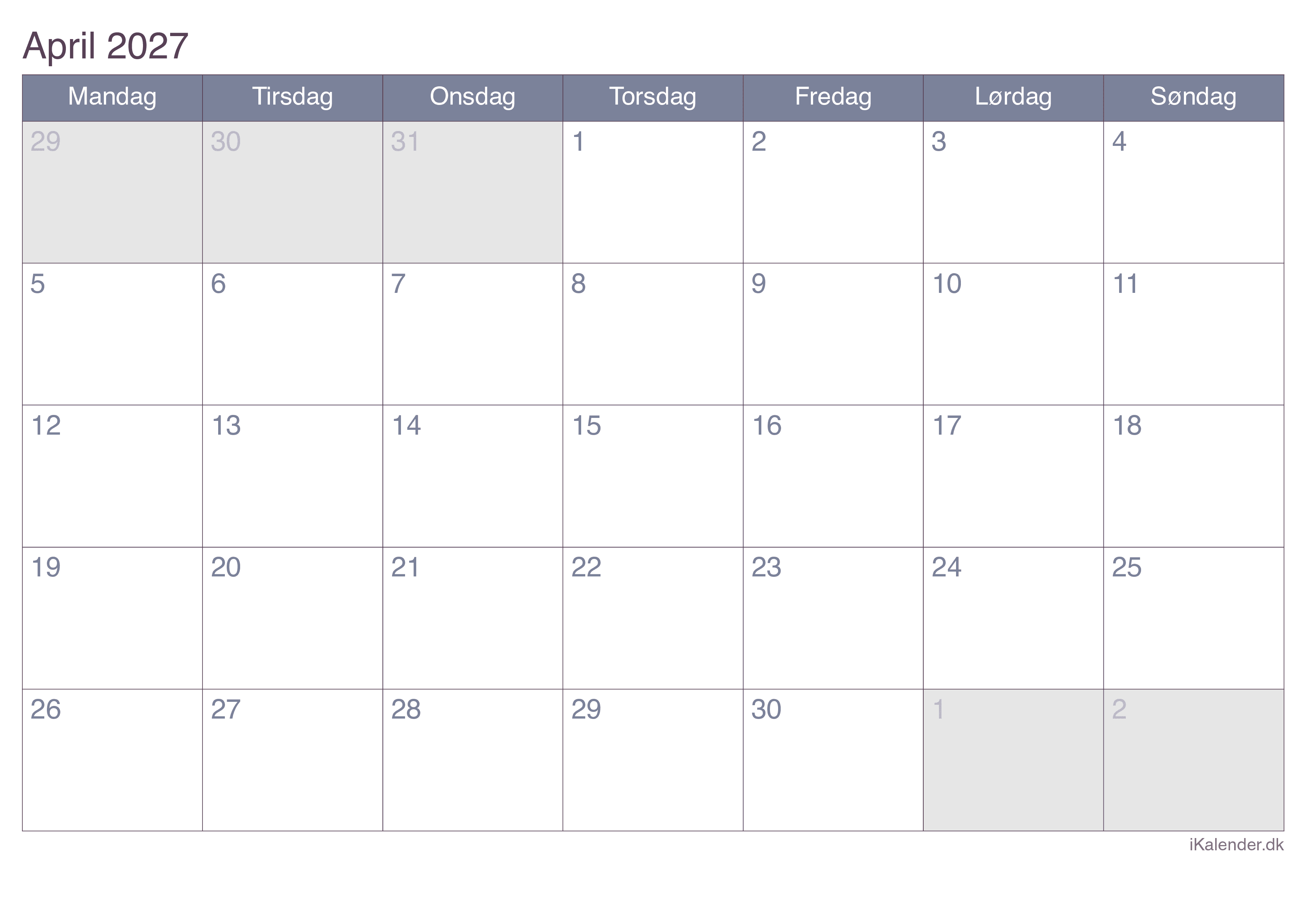 Kalender for april 2027 klar til print