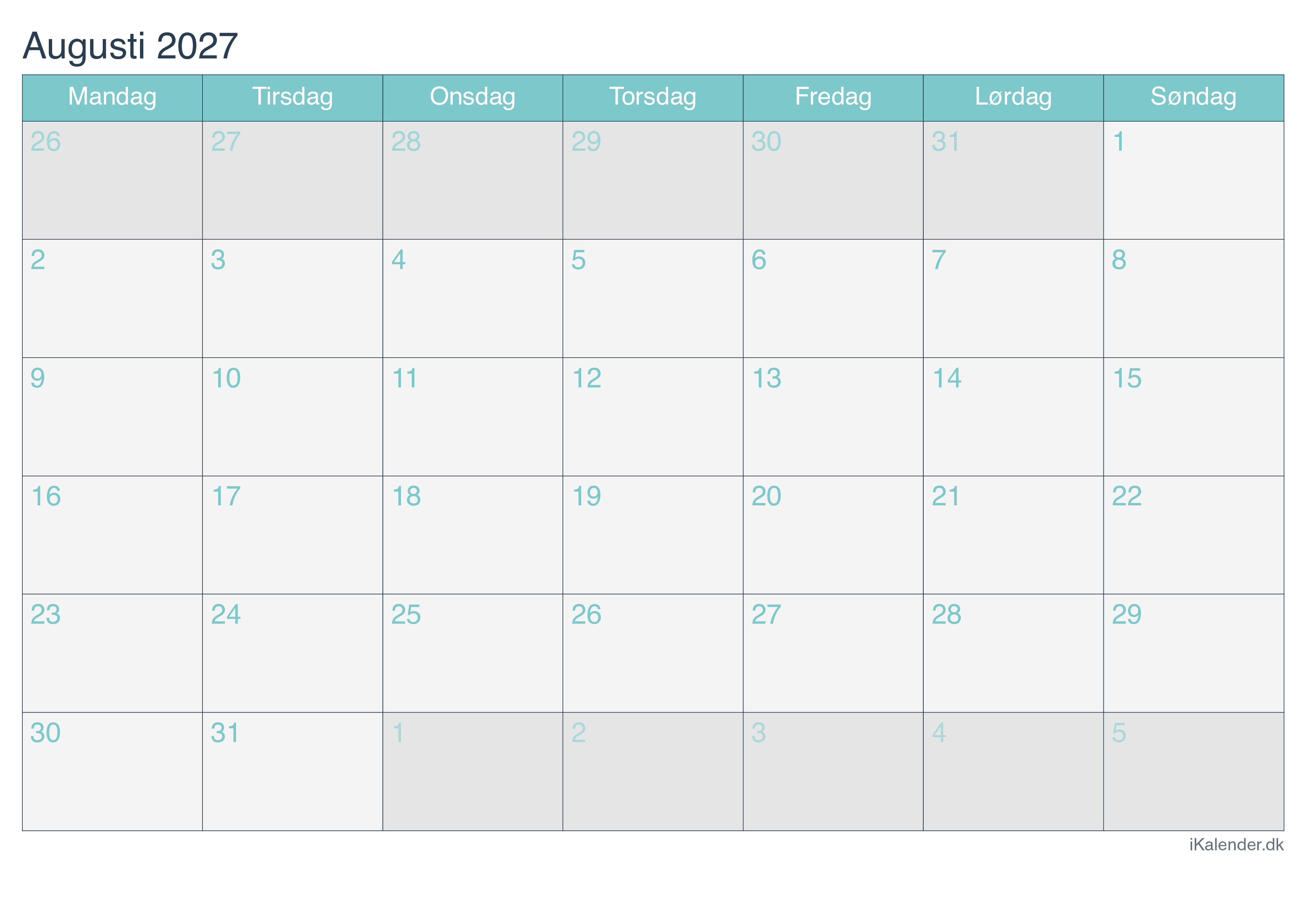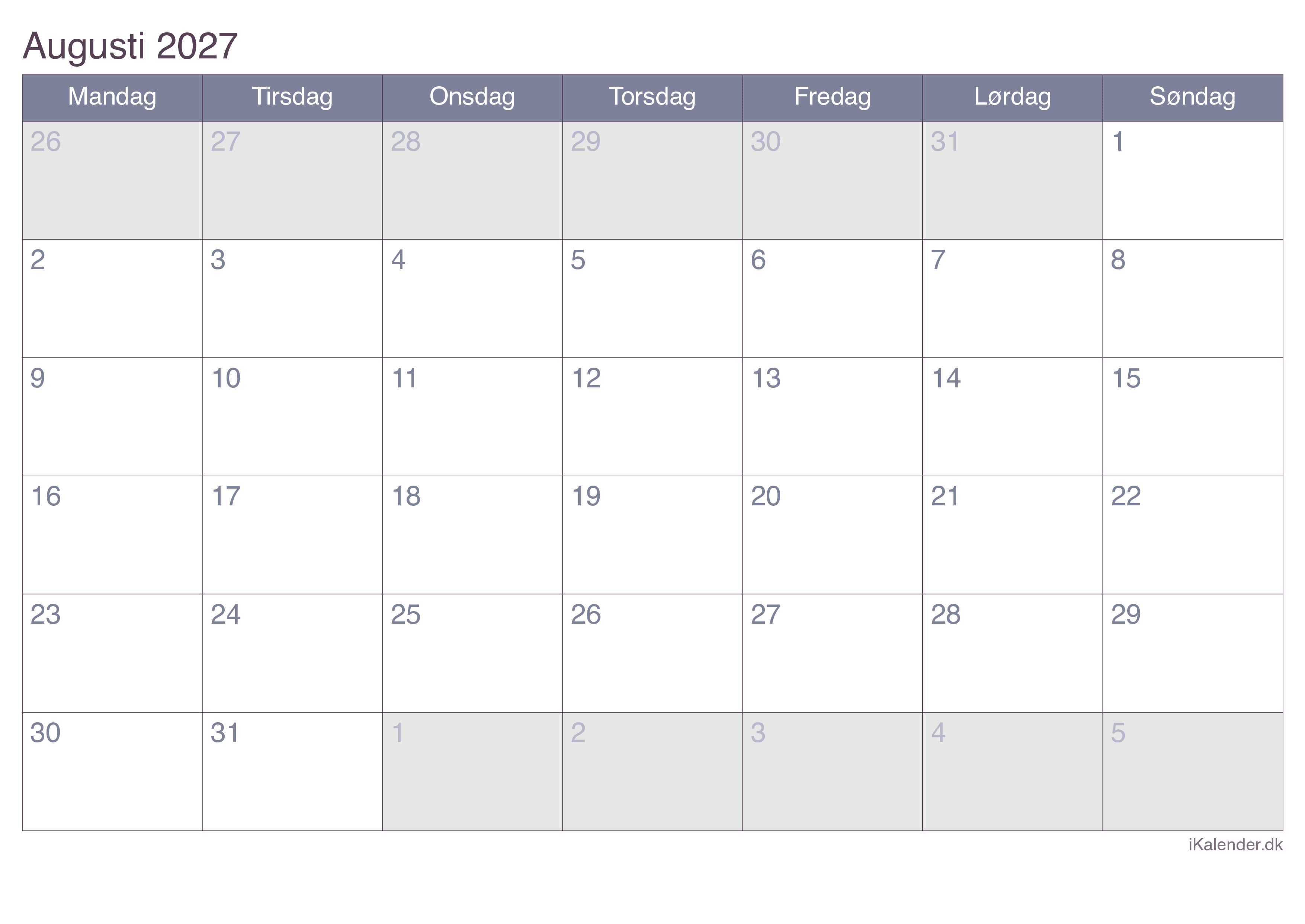 Kalender for august 2027 klar til print