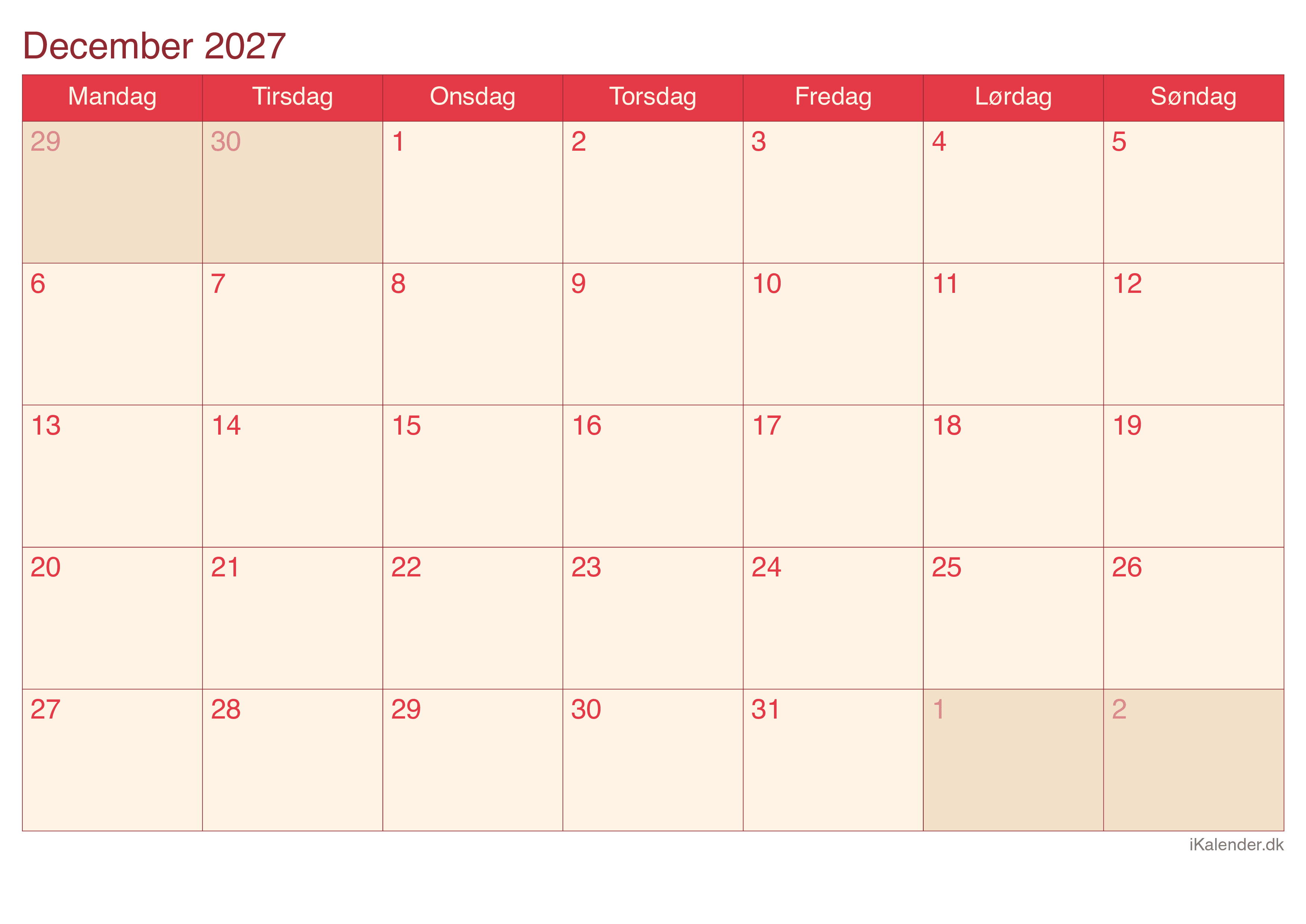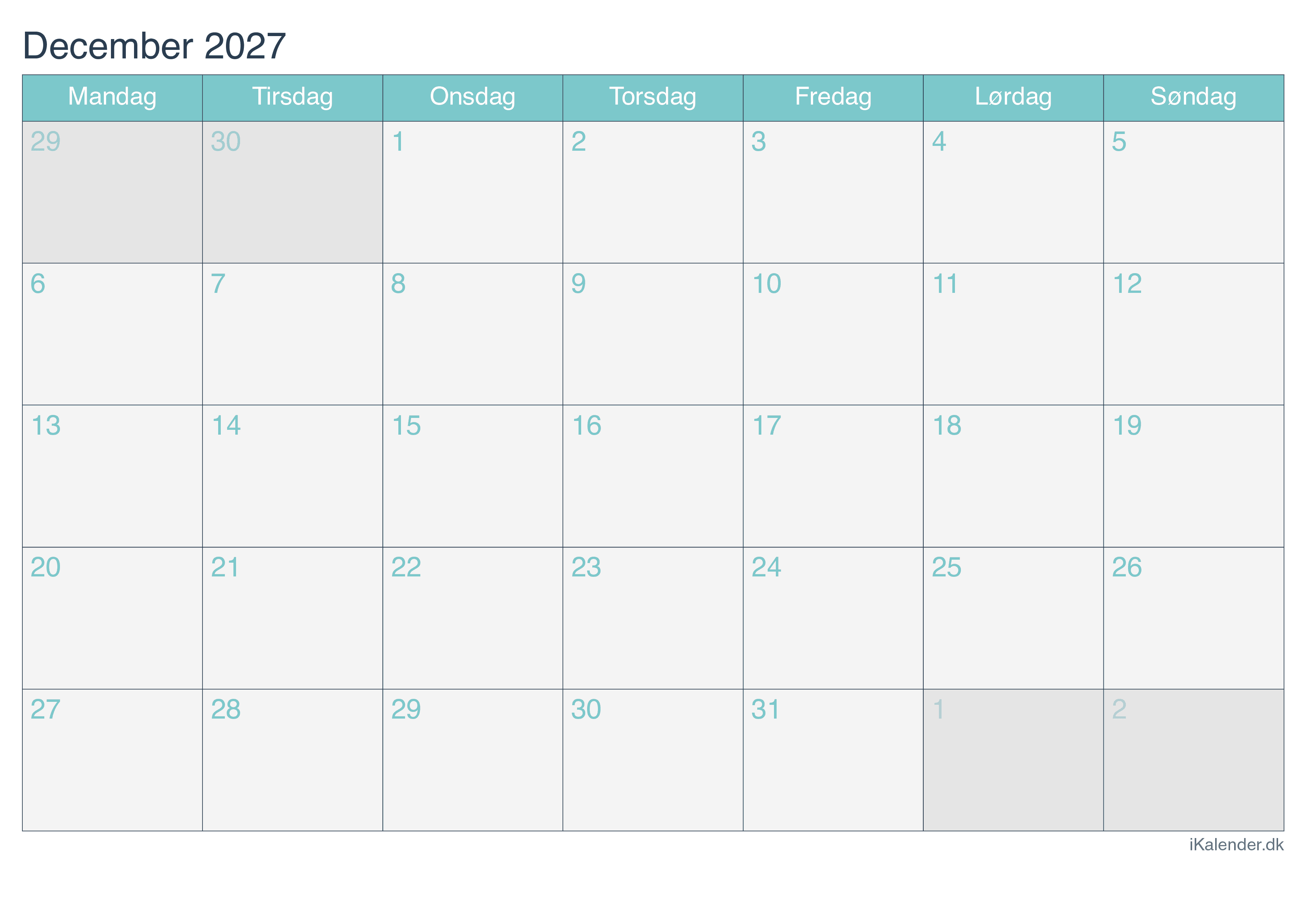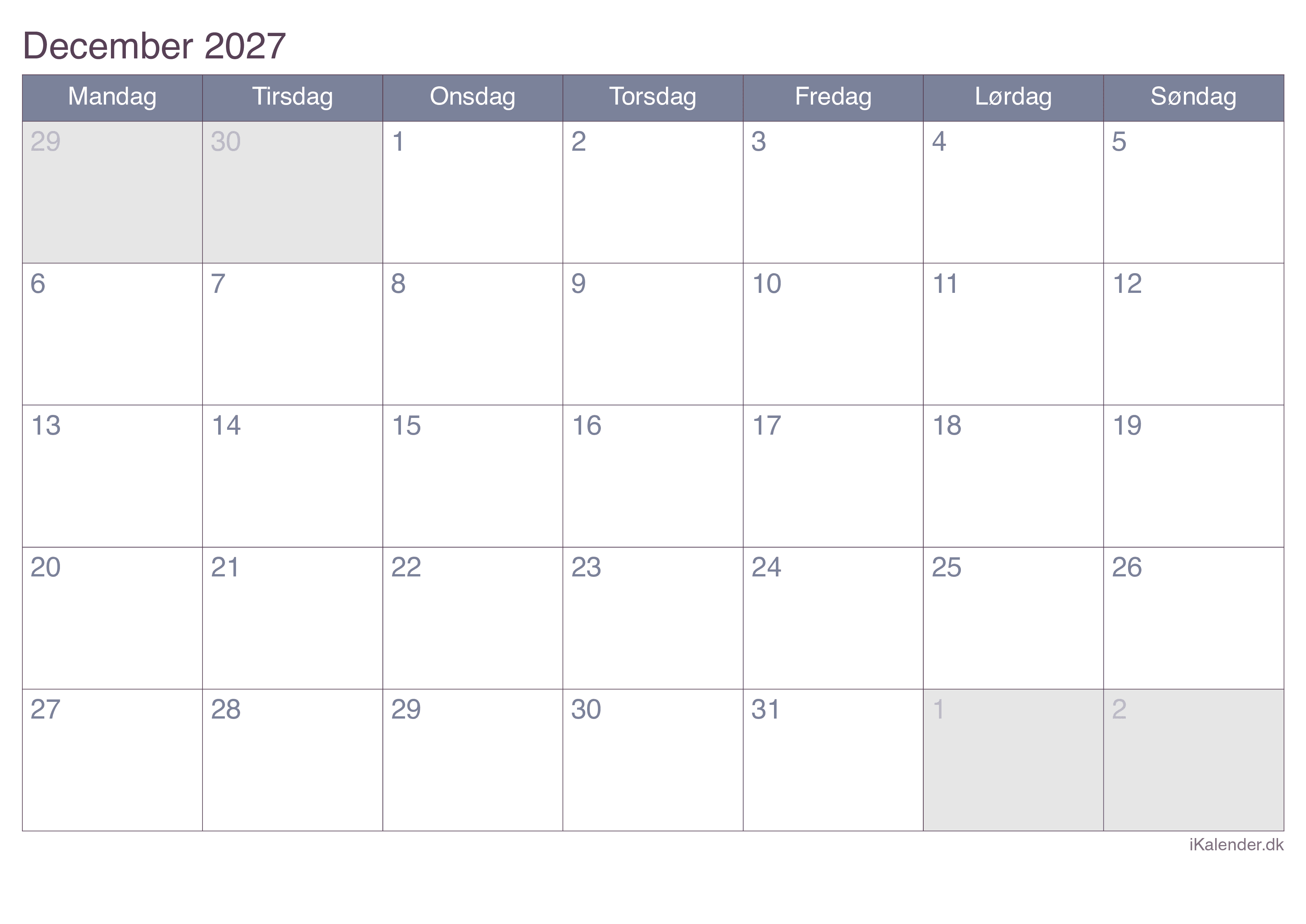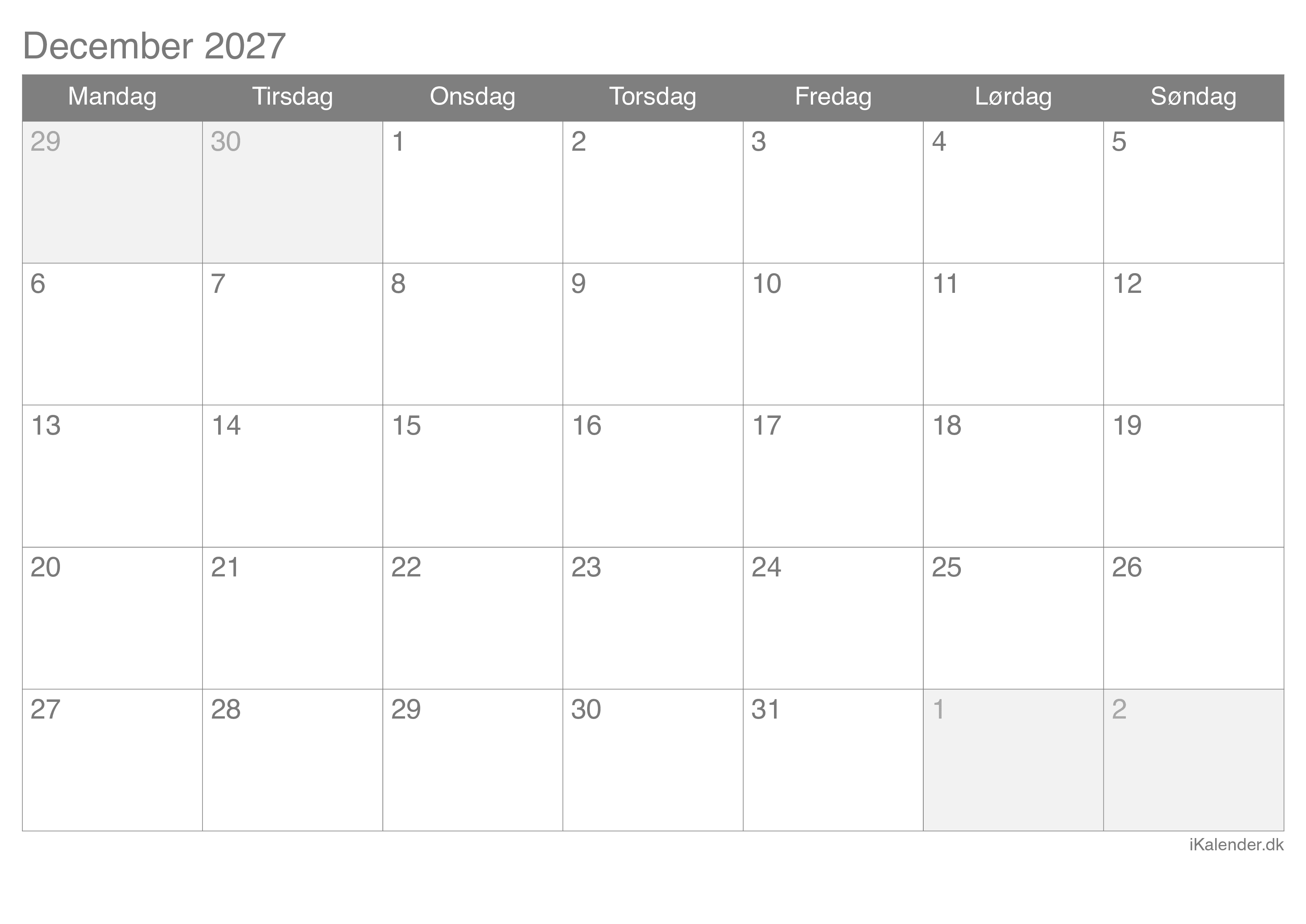 Kalender for december 2027 klar til print