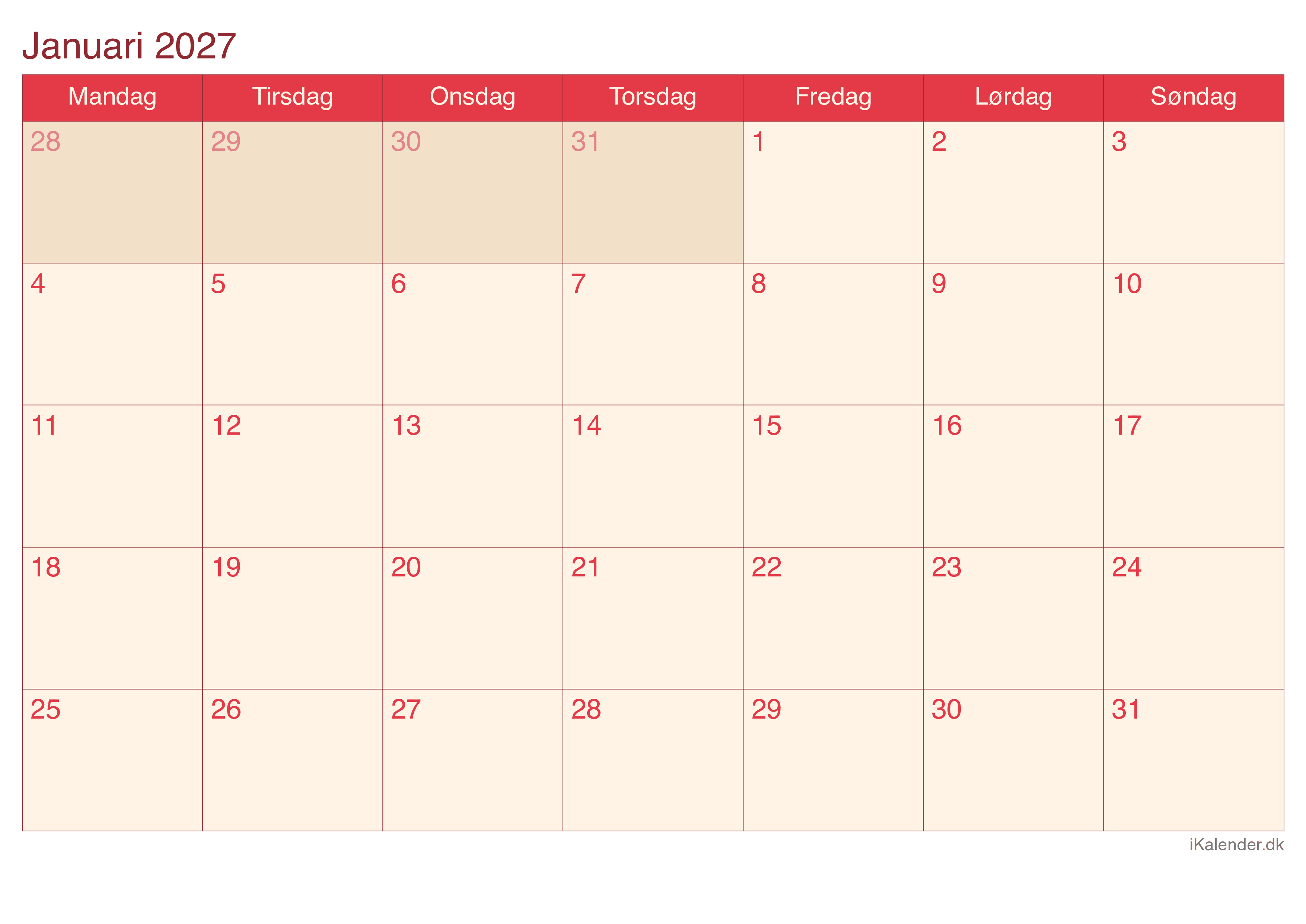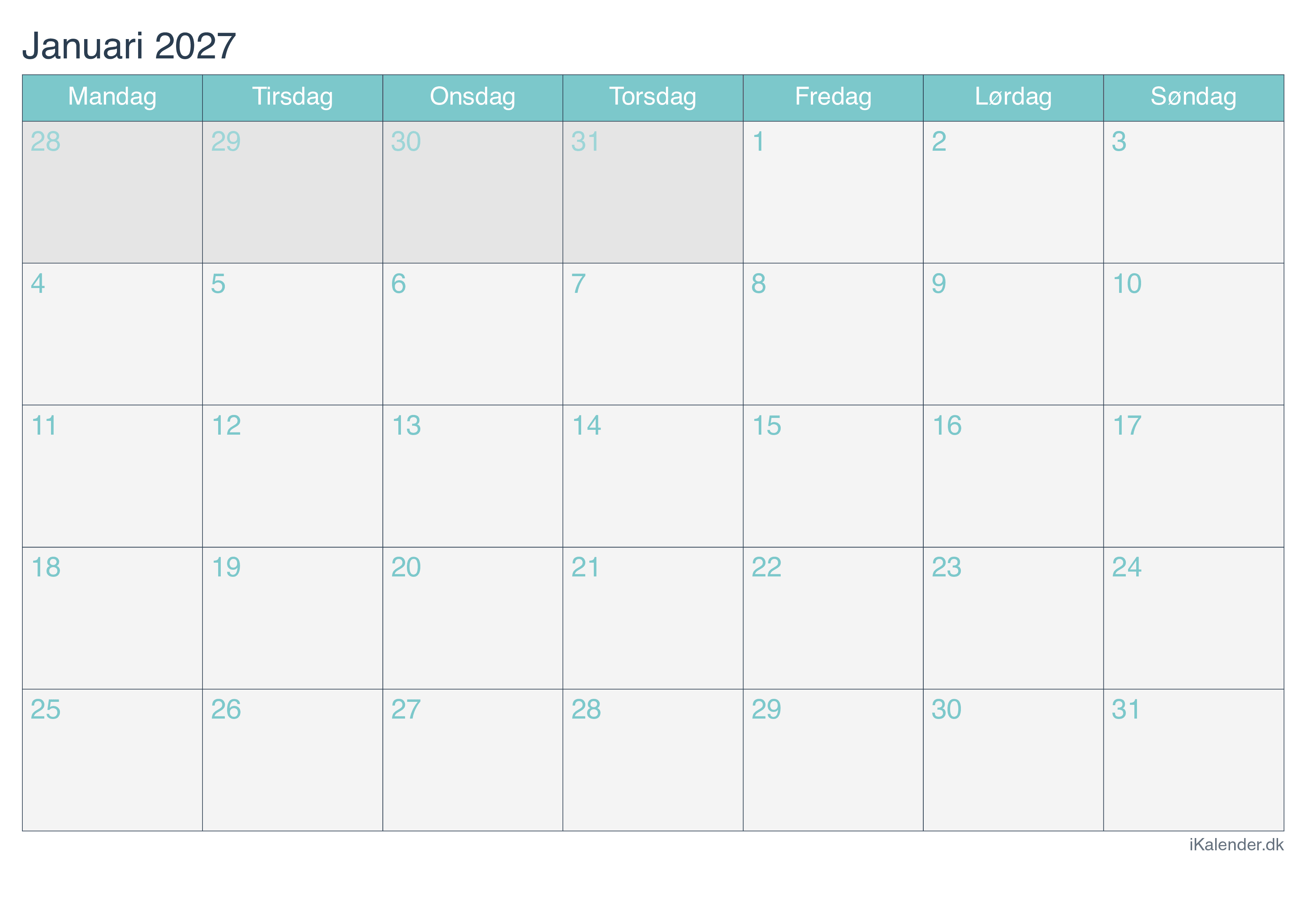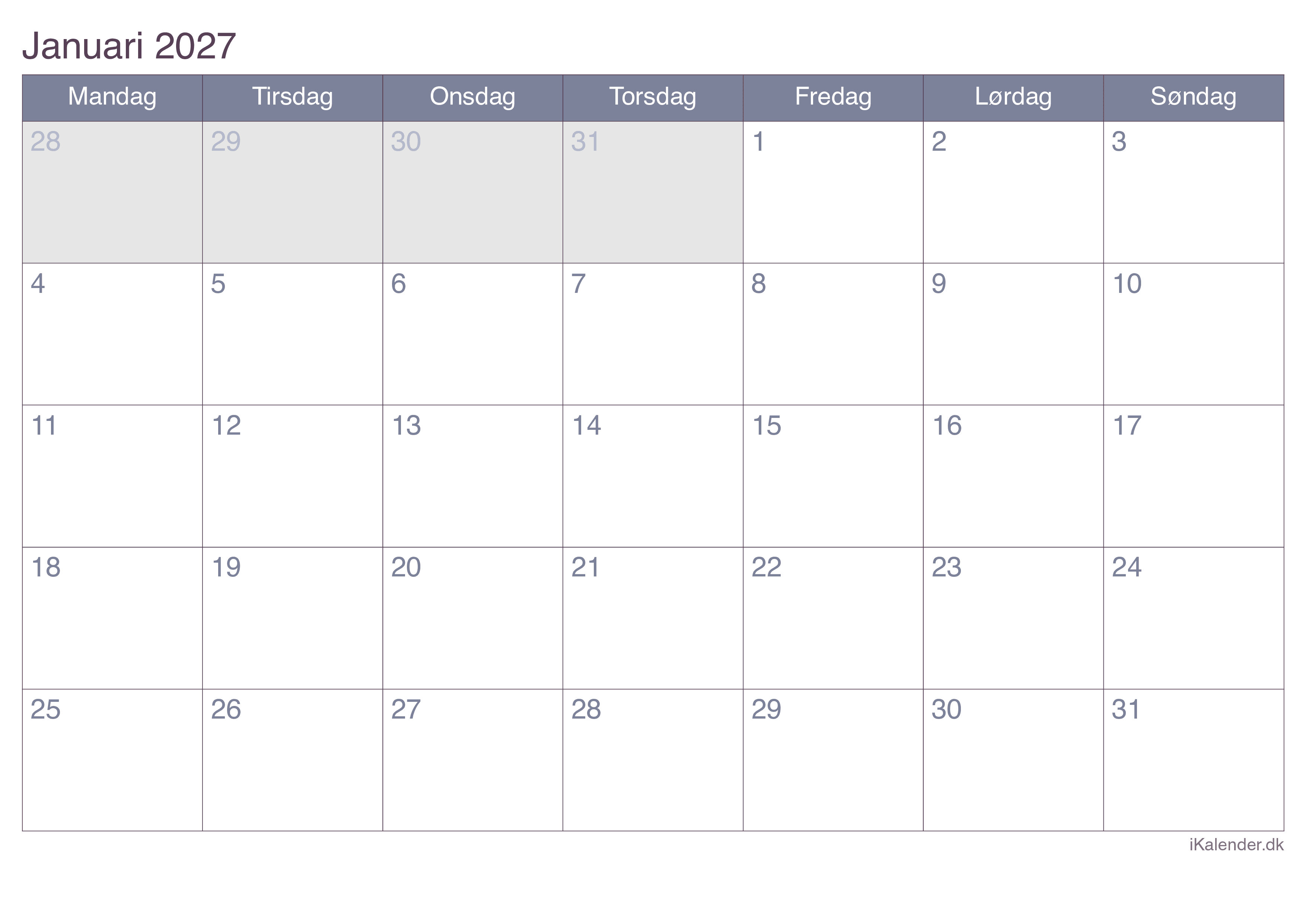 Kalender for januar 2027 klar til print