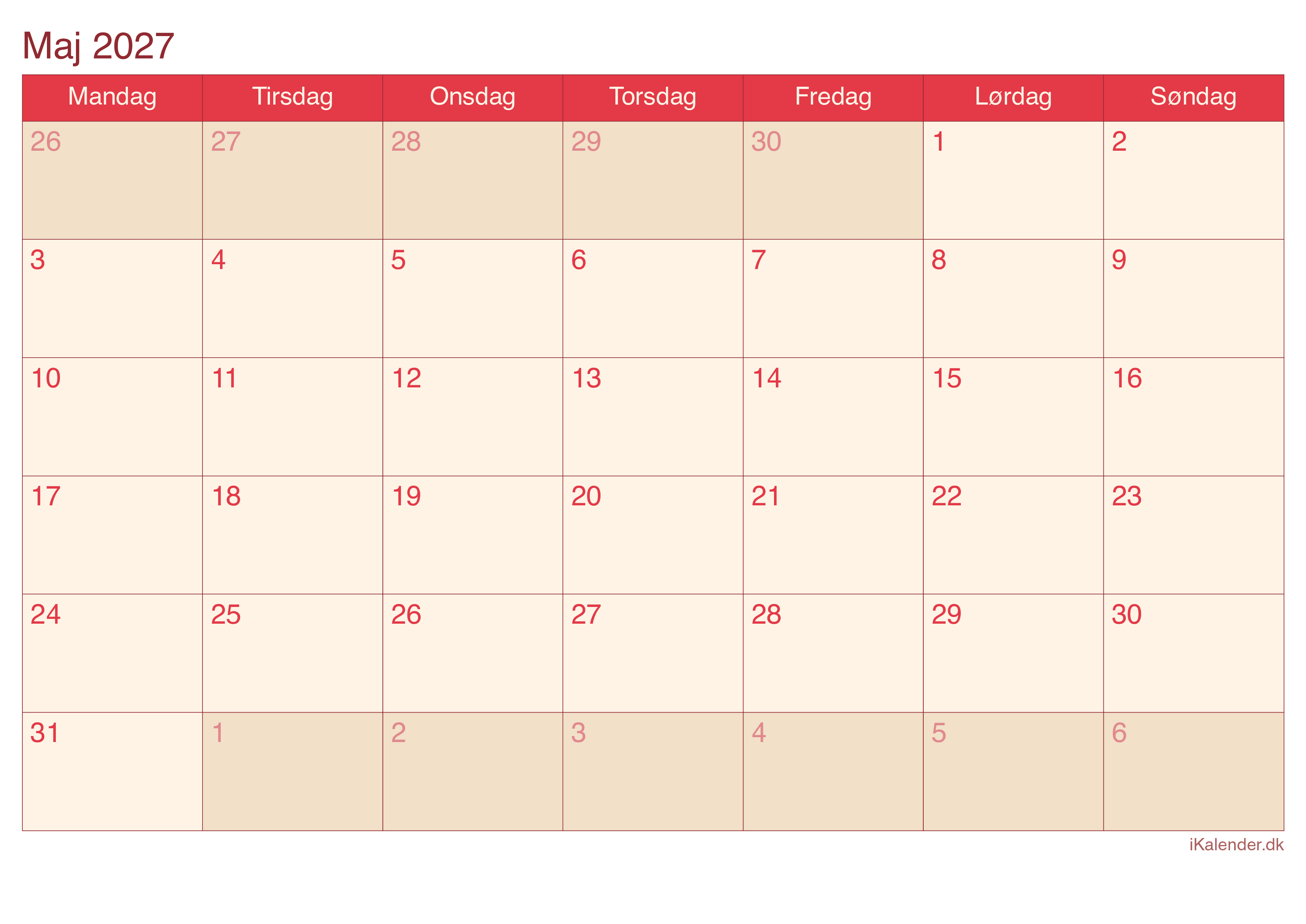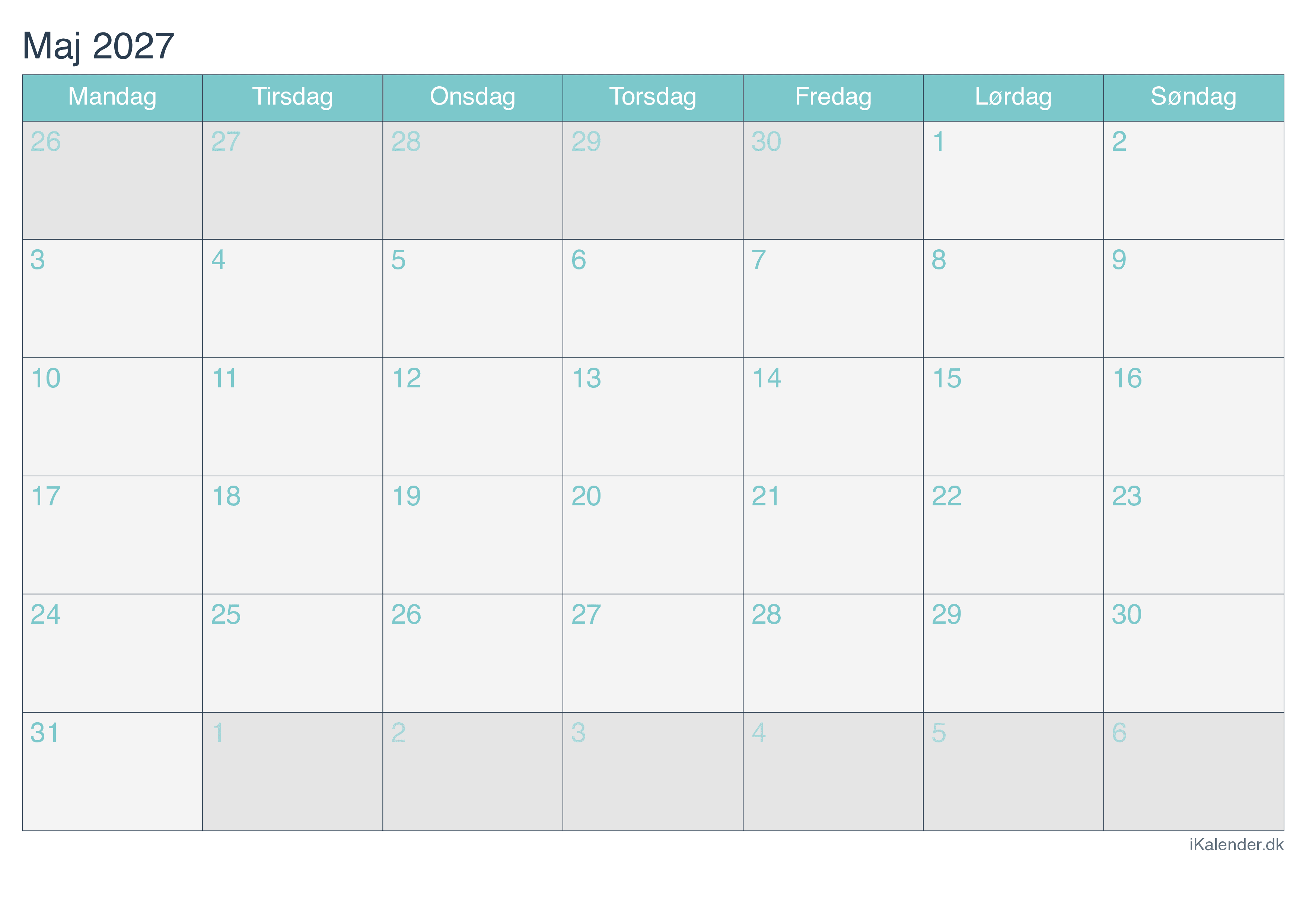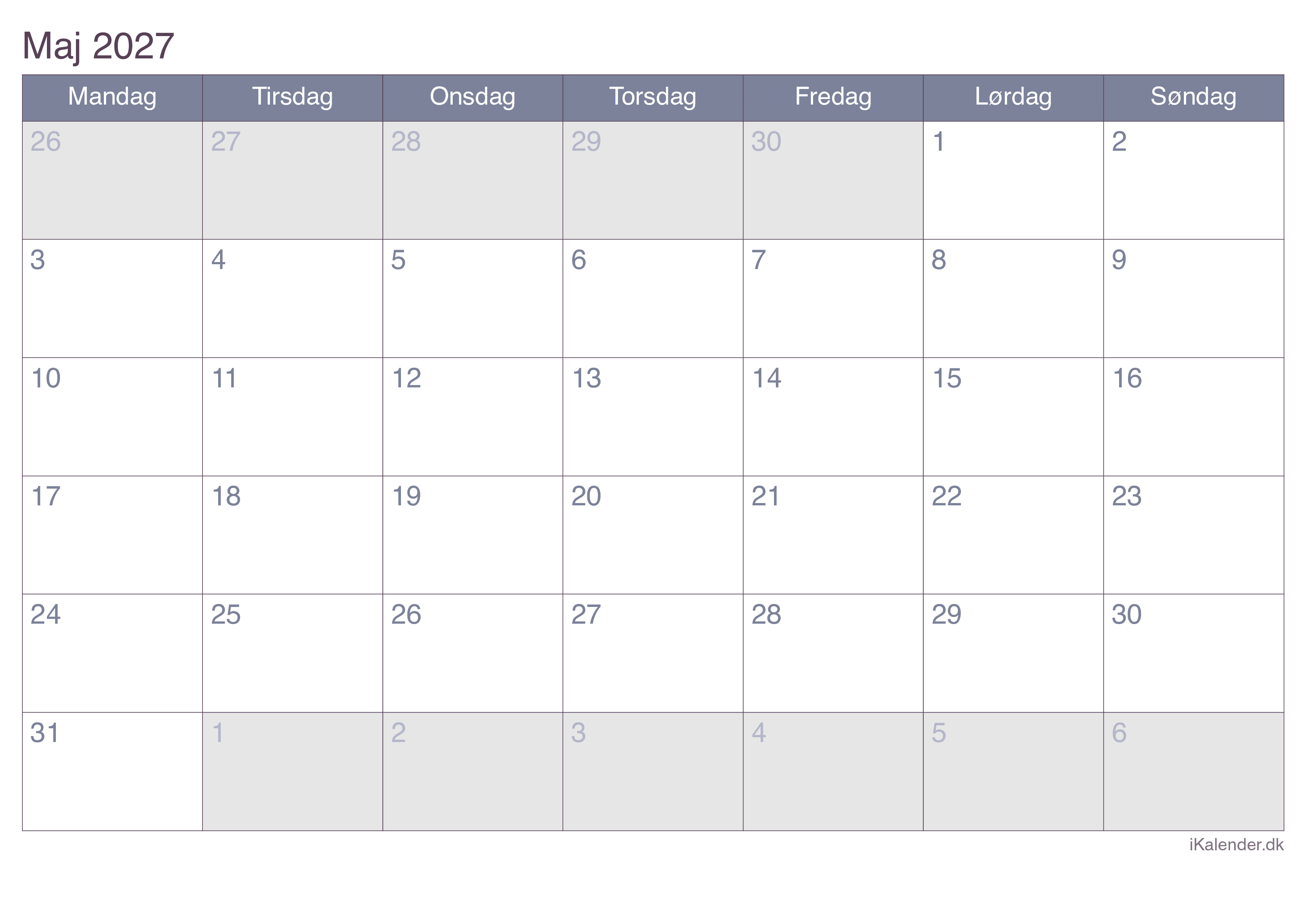 Kalender for maj 2027 klar til print