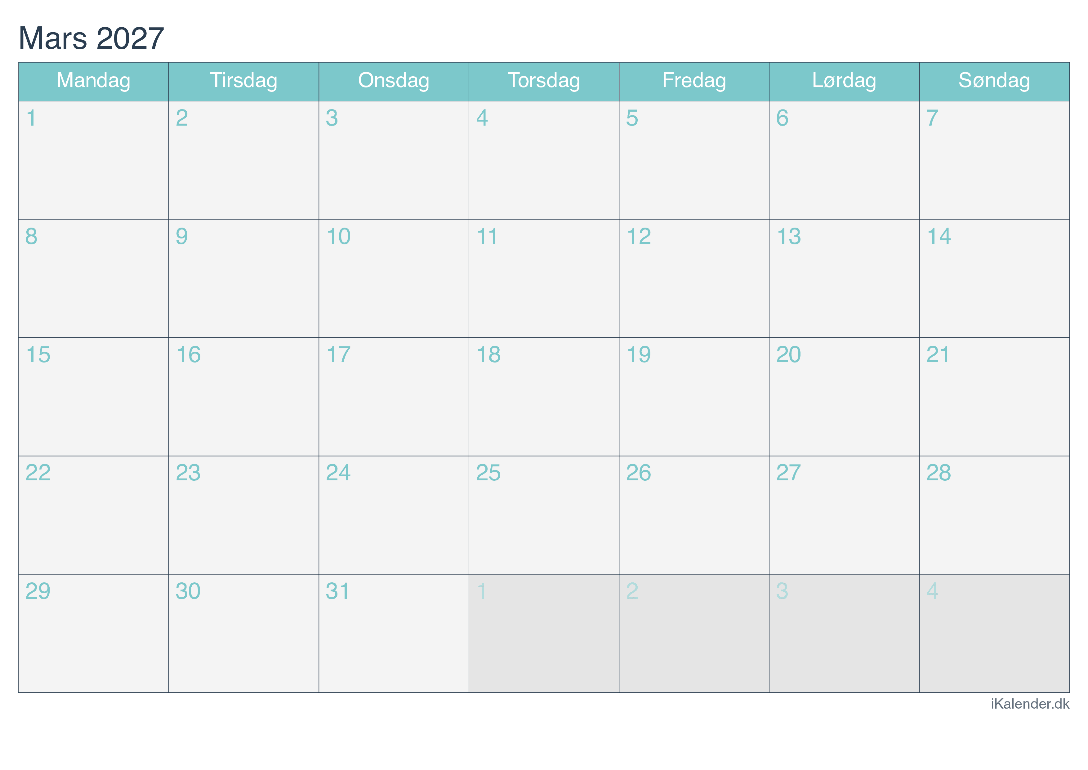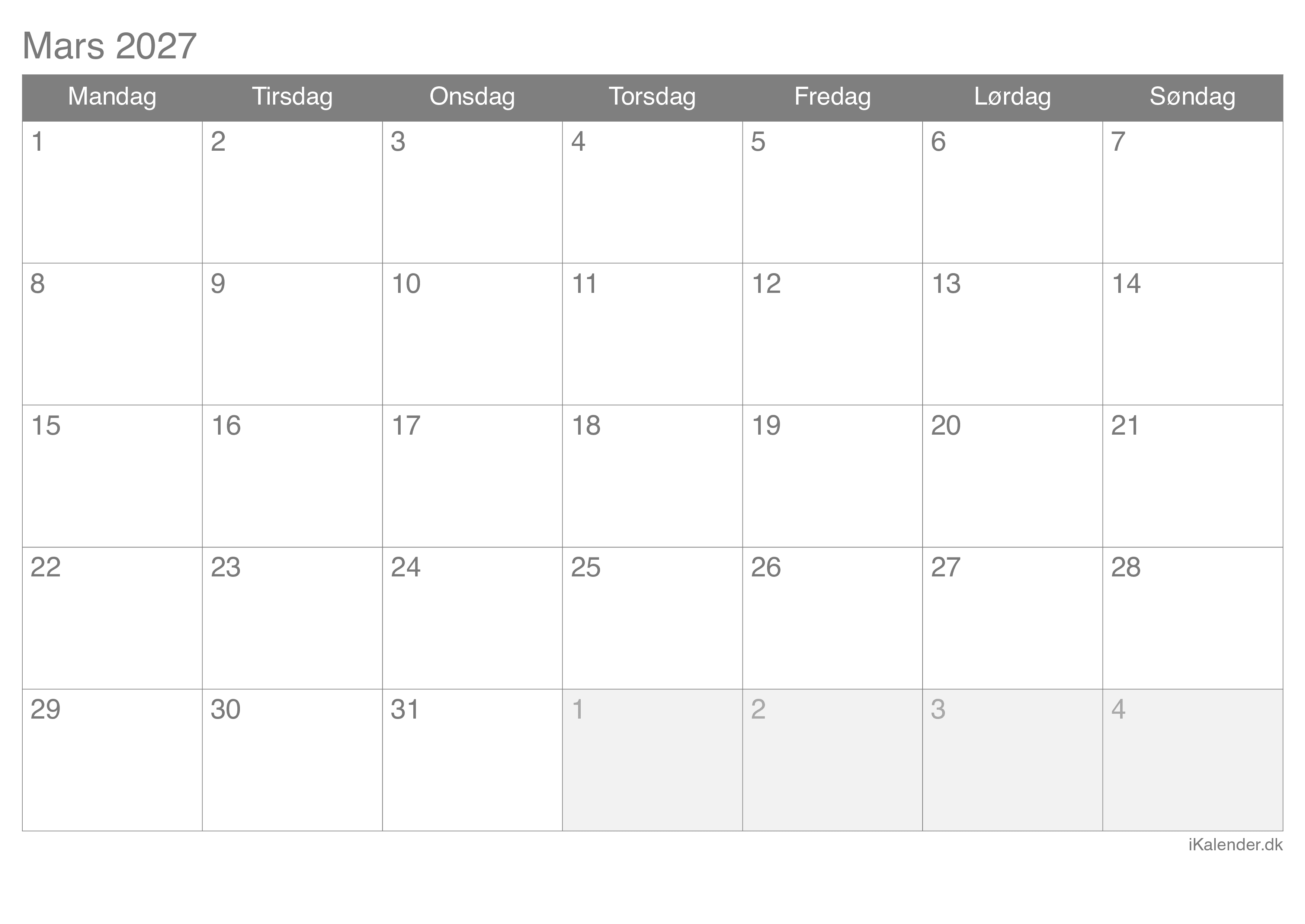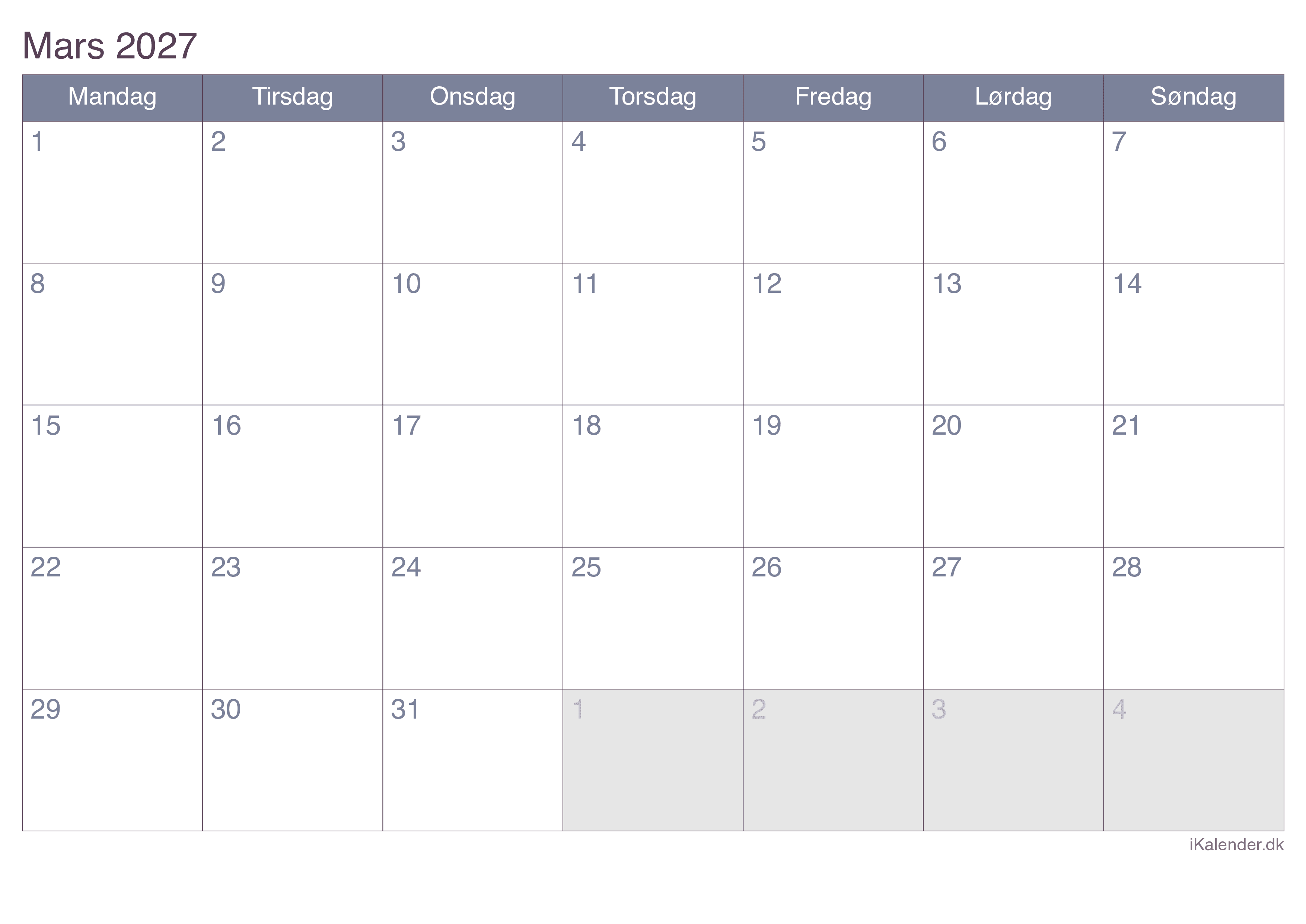 Kalender for marts 2027 klar til print
